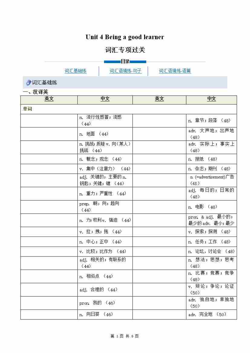 Unit 4 Being a good learner(重难词汇精炼)(原卷版)八上冀教