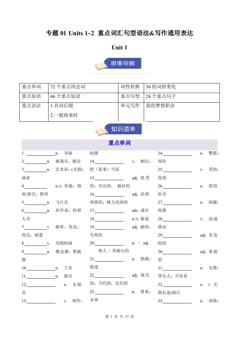 专题01 Units 1~2 重点词汇句型语法&写作通用表达(期末复习知识清单)(默写版)88