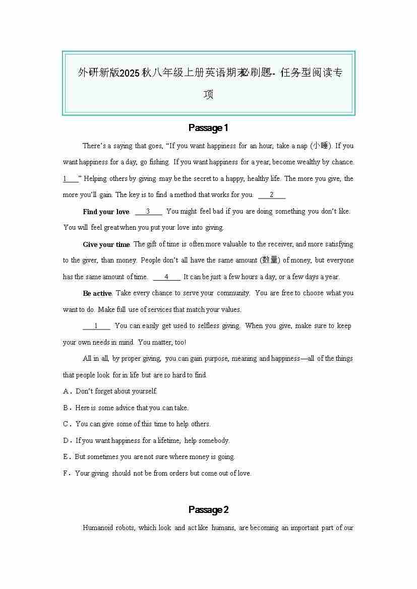 25秋八上外研英语 任务型阅读专项(原卷版)
