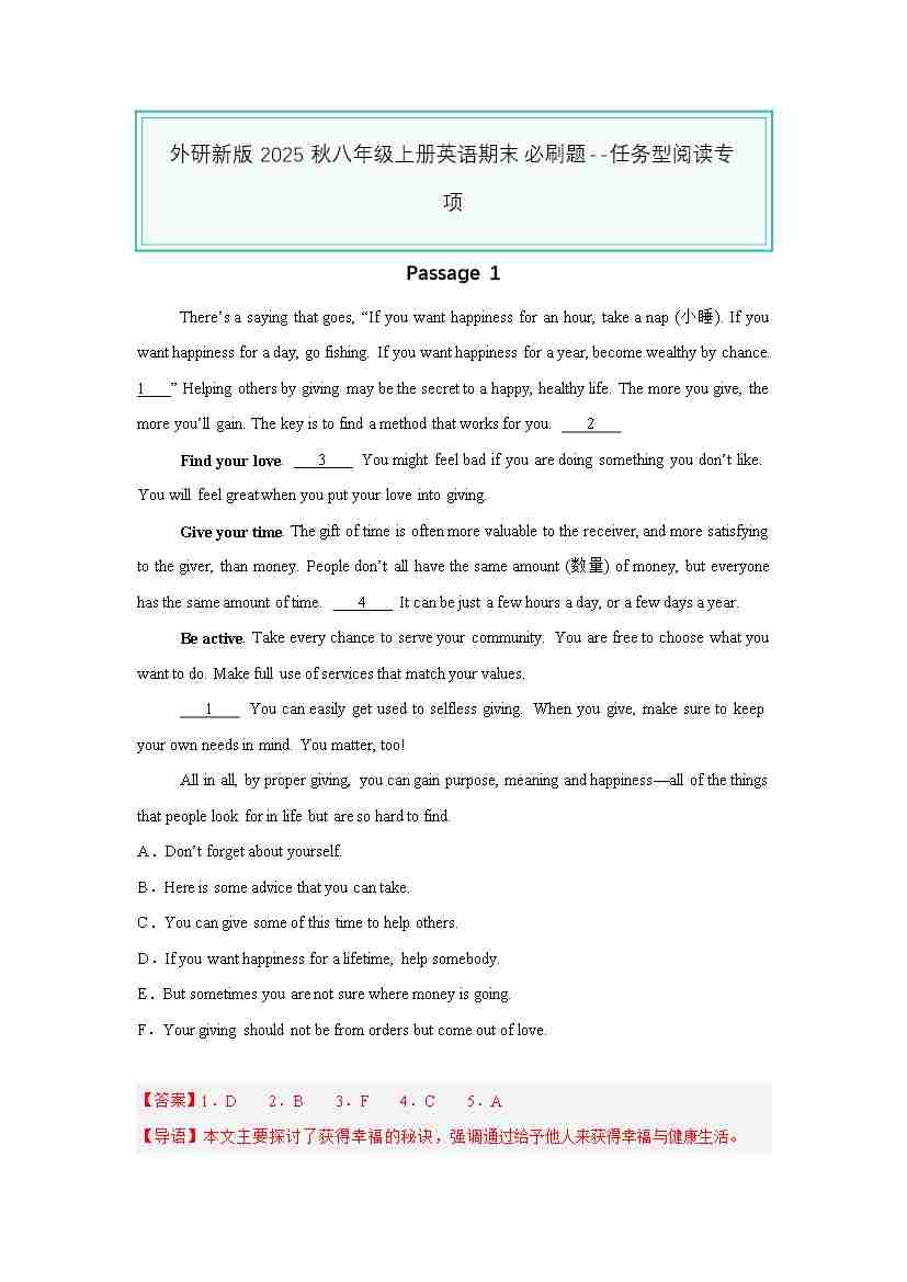 25秋八上外研英语 任务型阅读专项(解析版)
