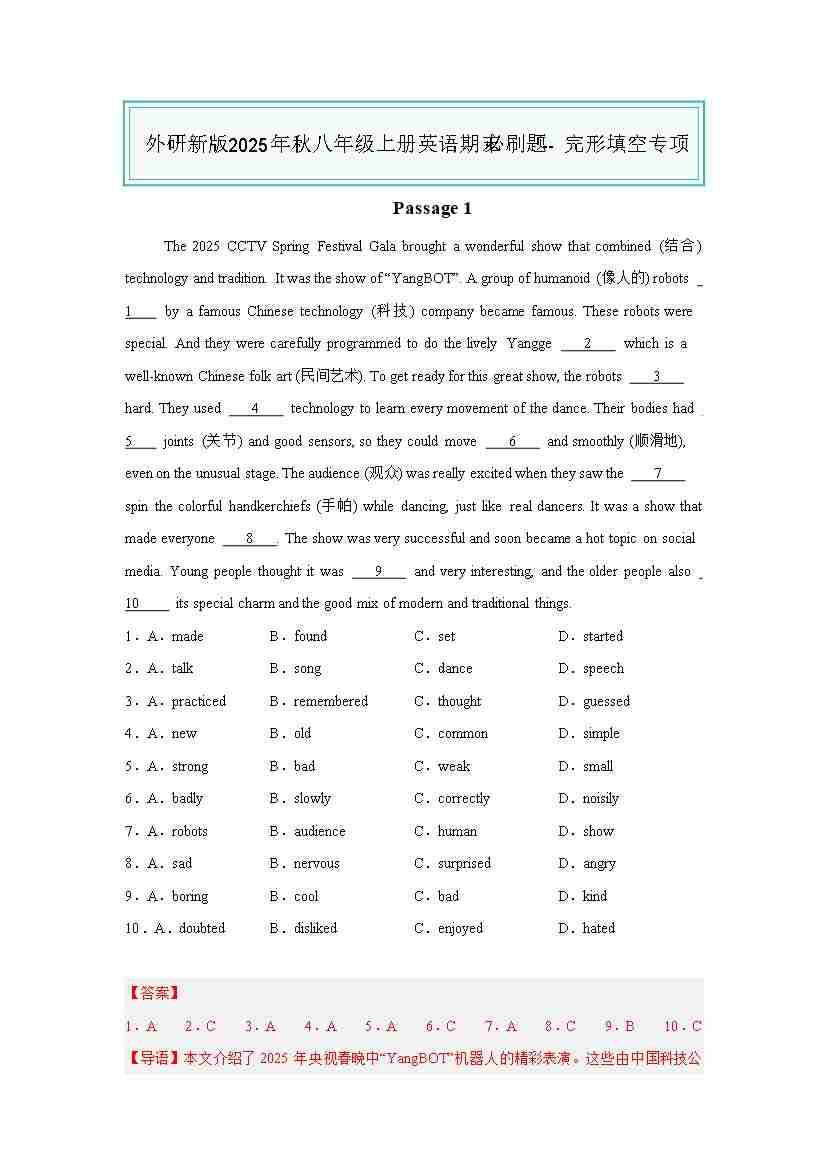 25秋八上外研英语 完形填空专项(解析版)