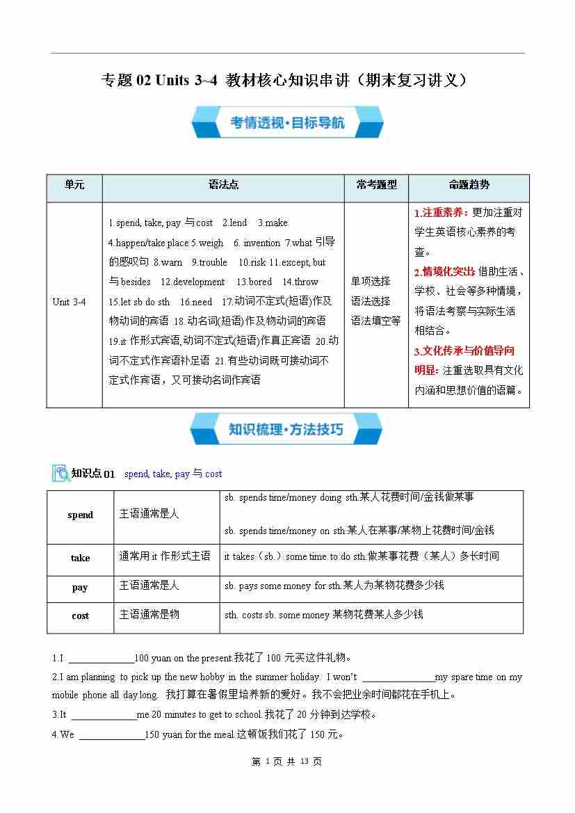 专题02 Units 3~4 教材核心知识串讲(期末复习讲义)(解析版)