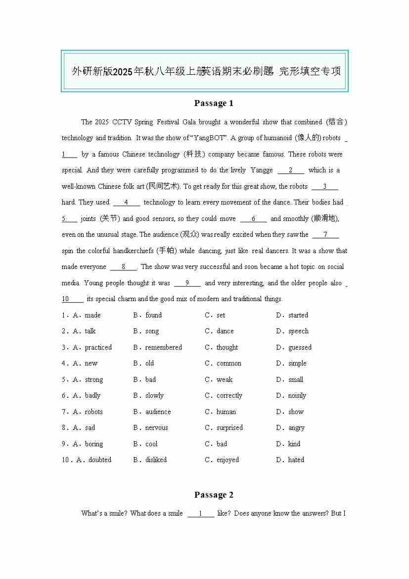 25秋八上外研英语 完形填空专项(原卷版)