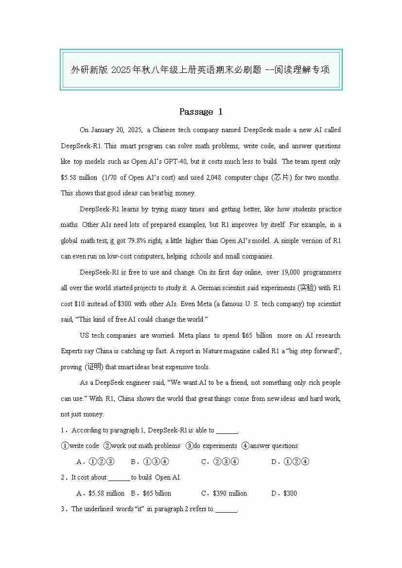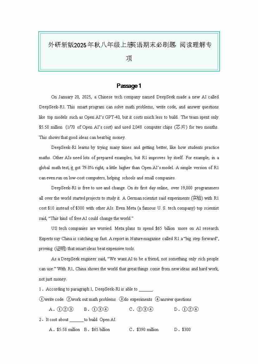 25秋八上外研英语 阅读理解专项(解析版)
