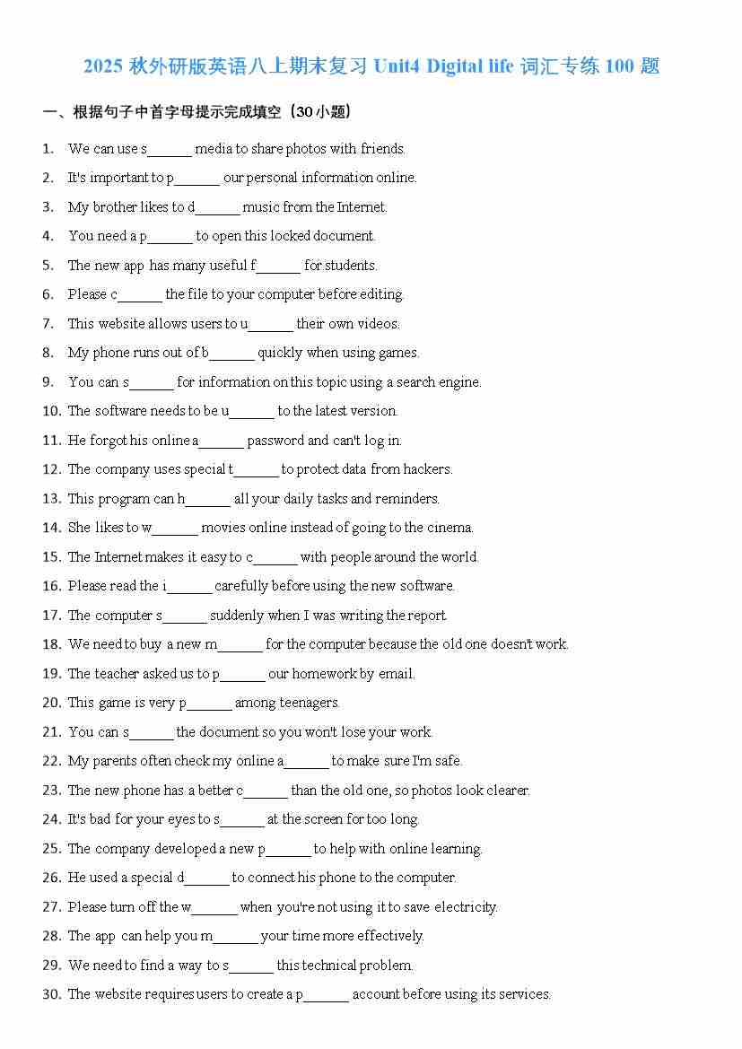 2025秋外研版英语八上期末复习Unit4 Digital life词汇专练100题
