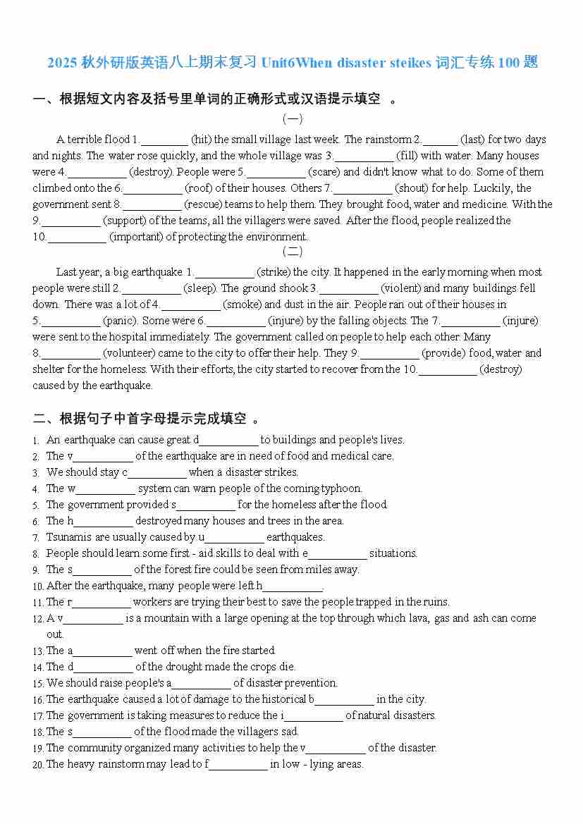 2025秋外研版英语八上期末复习Unit6When disaster steikes词汇专练100题