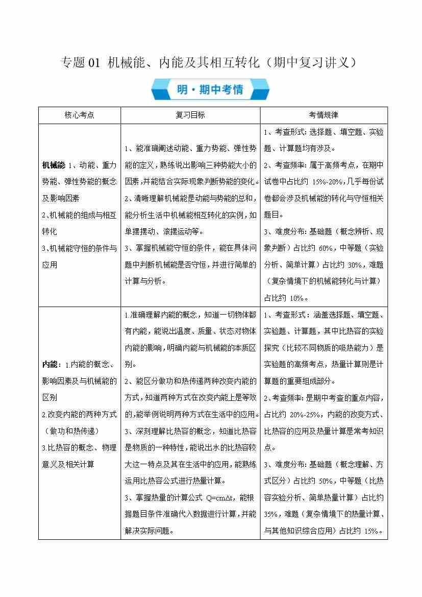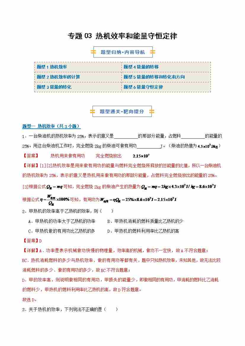 专题03 热机效率和能量守恒定律(期中专项训练)(教师版)
