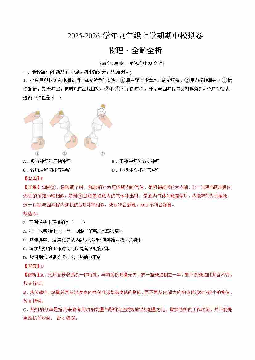 九年级物理上学期期中模拟卷(北师大版2024)(全解全析)