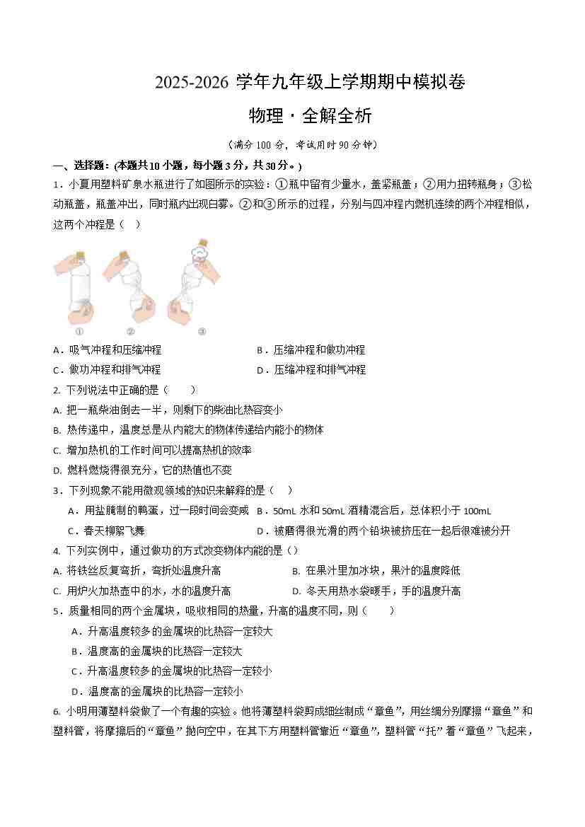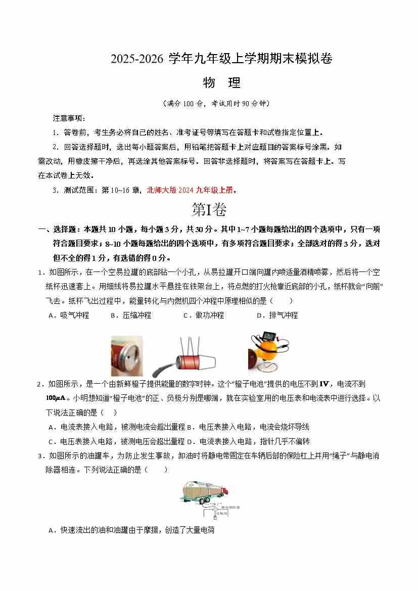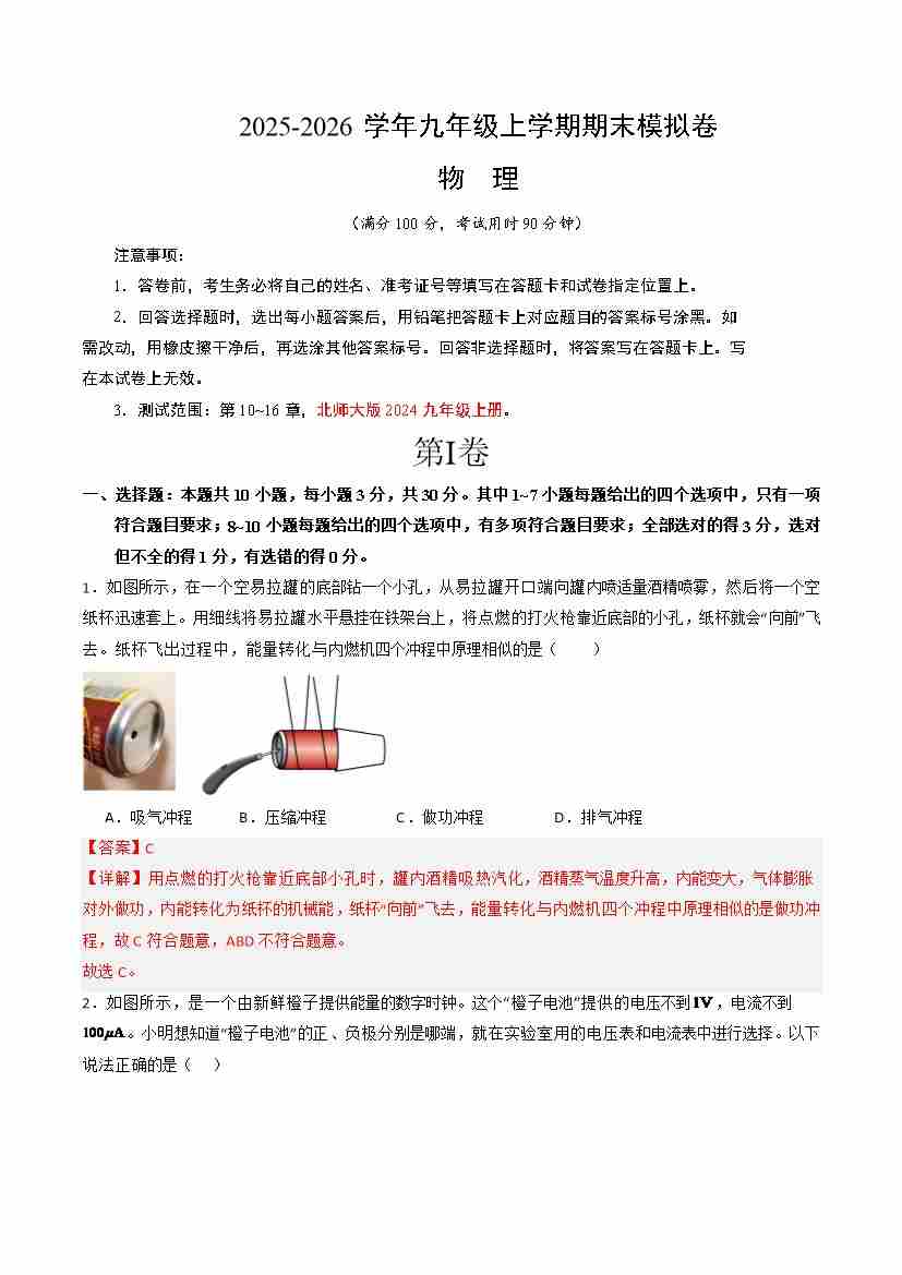 九年级物理上学期期中模拟卷(北师大版2024)(学生版)