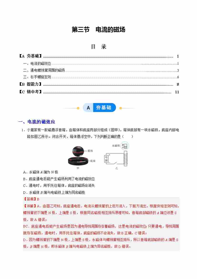 第十四章第三节 电流的磁场(分层作业)(解析版)