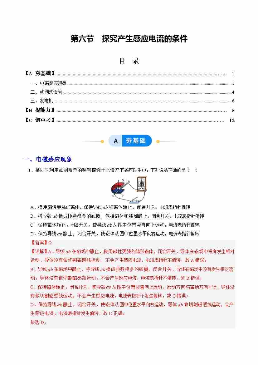 第十四章第六节 探究产生感应电流的条件(分层作业)(解析版)