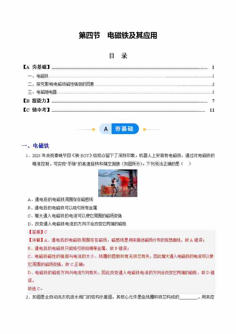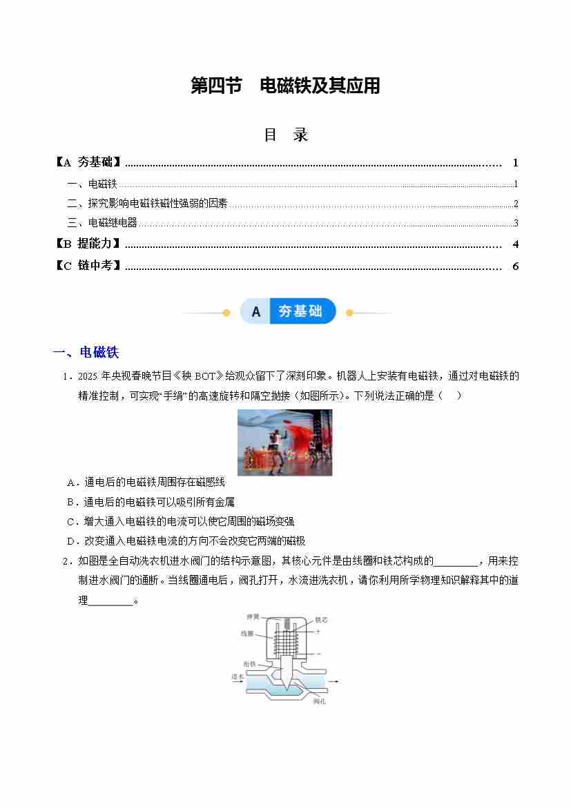 第十四章第四节 电磁铁及其应用(分层作业)(原卷版)