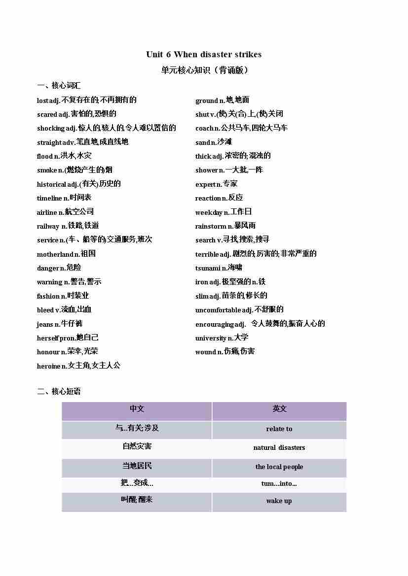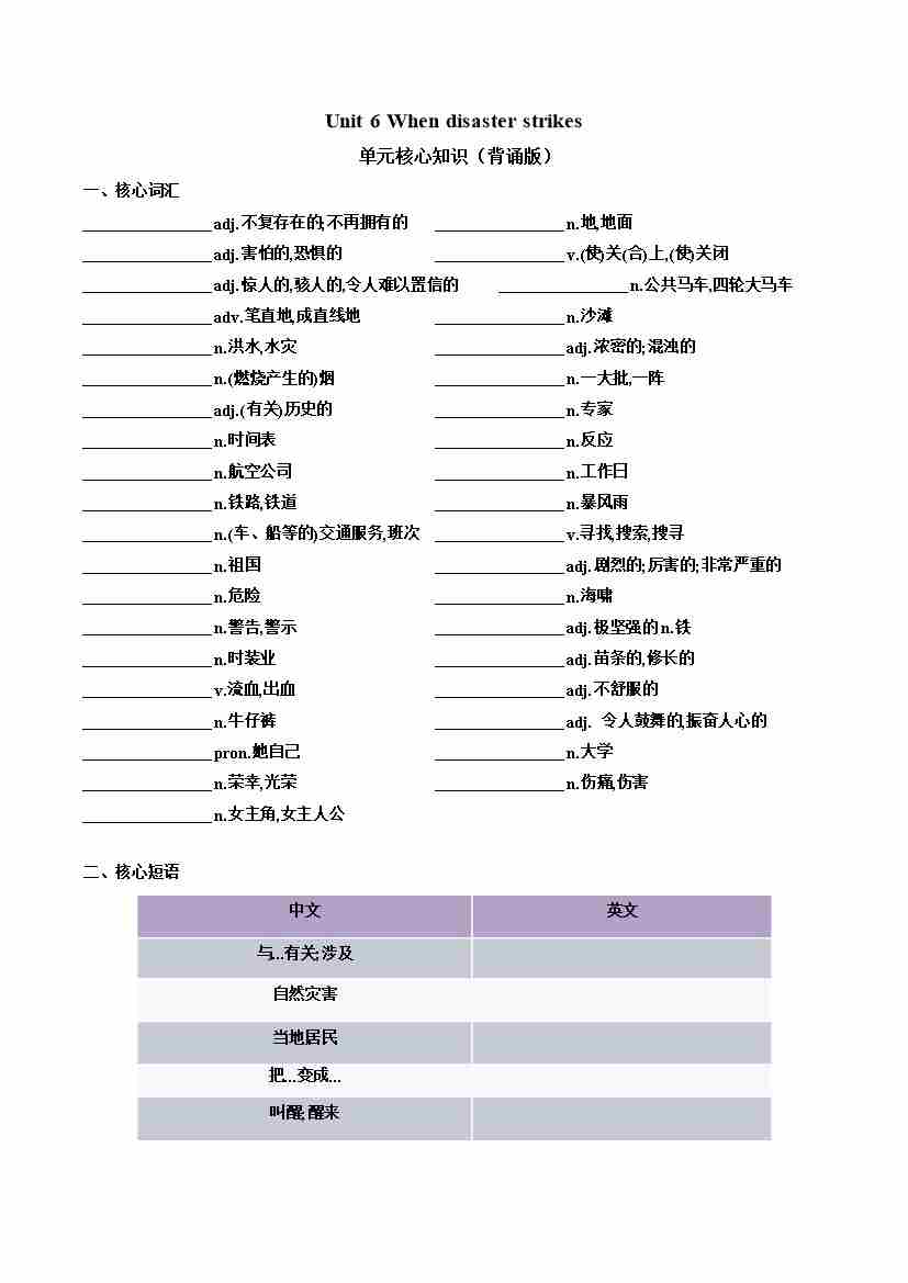 Unit 6 When disaster strikes(单元核心知识)(默写版)