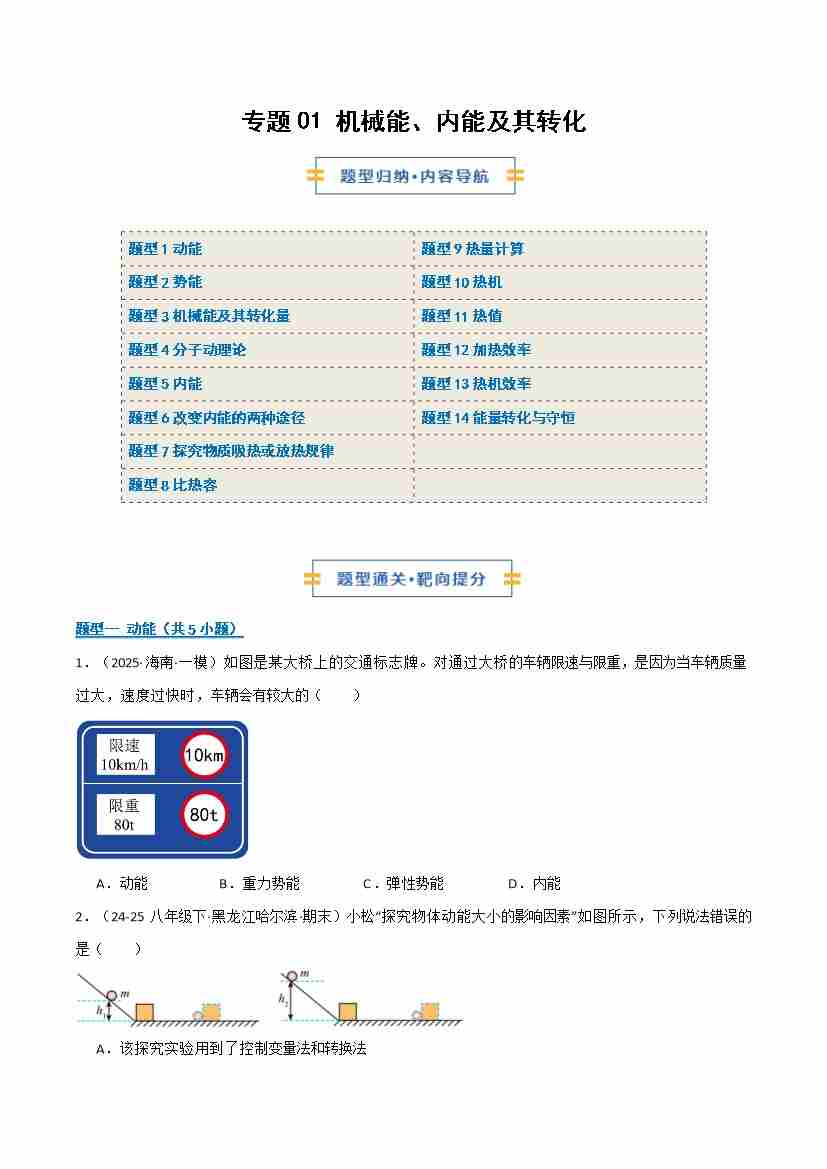 专题01 机械能、内能及其转化(期末专项训练)(原卷版)