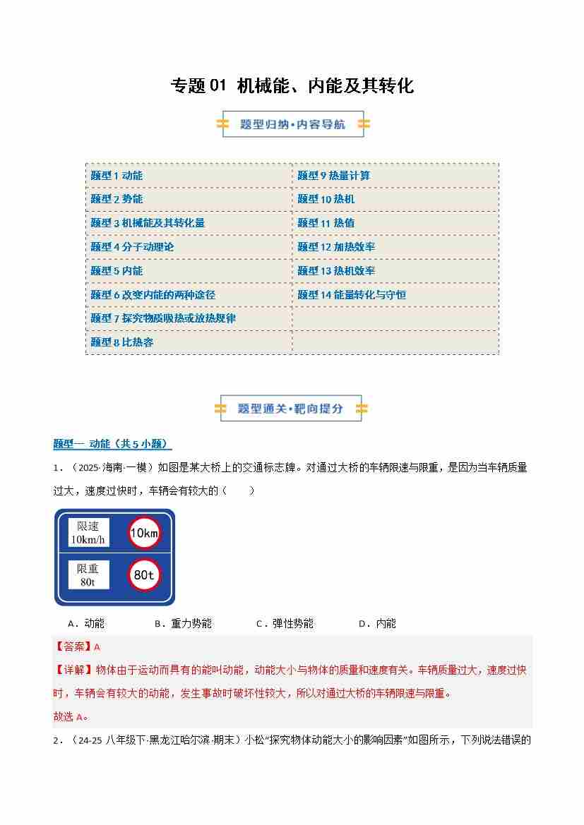 专题01 机械能、内能及其转化(期末专项训练)(解析版)