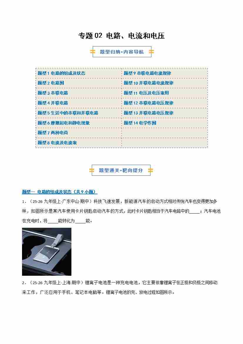 专题02 电路、电流和电压(期末专项训练)(原卷版)