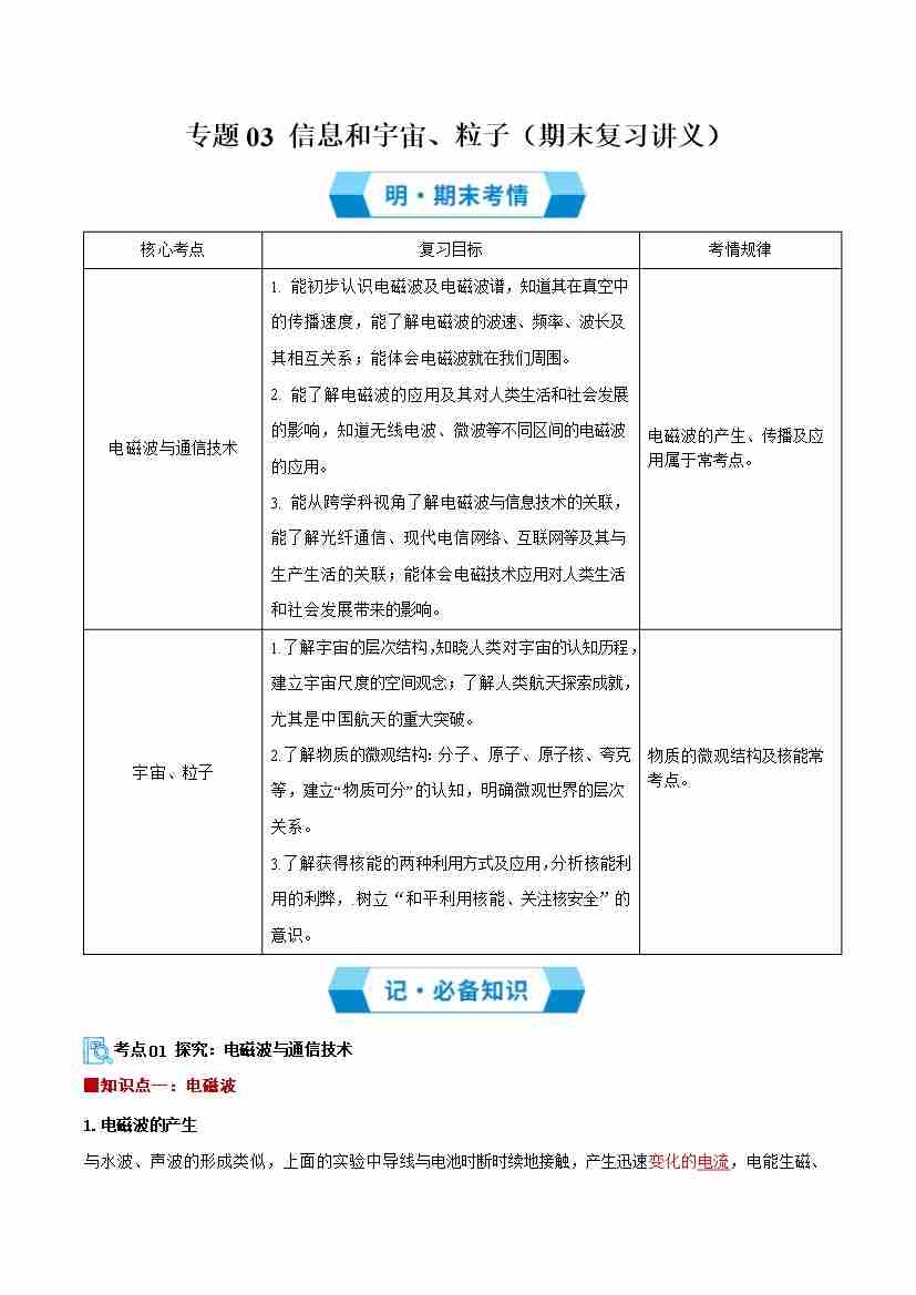 专题03 信息和宇宙、粒子(期末复习讲义)原卷版