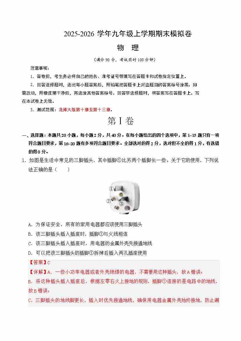九年级物理上学期期末模拟卷(北师大版)(全解全析)