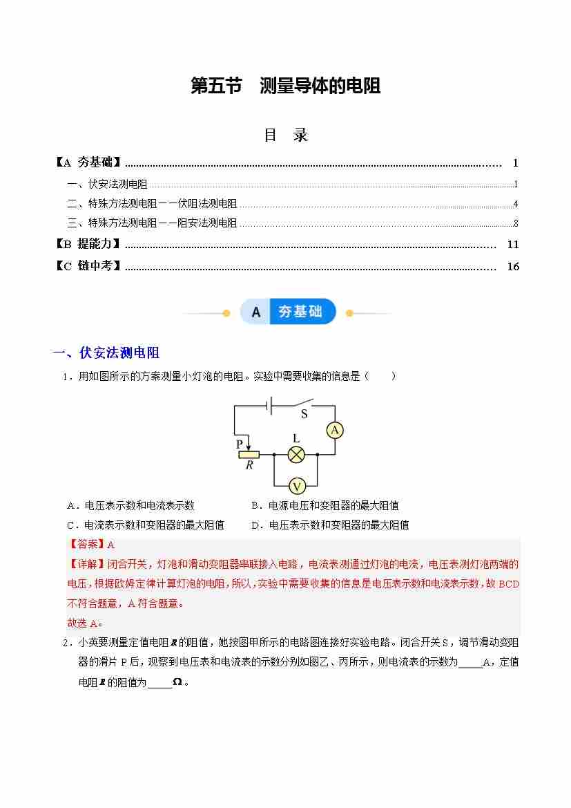 第十二章第五节 测量导体的电阻(分层作业)(解析版)