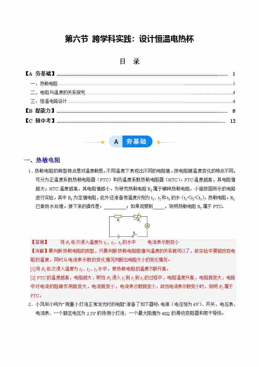 第十二章第六节 跨学科实践:设计恒温电热杯(分层作业)(解析版)