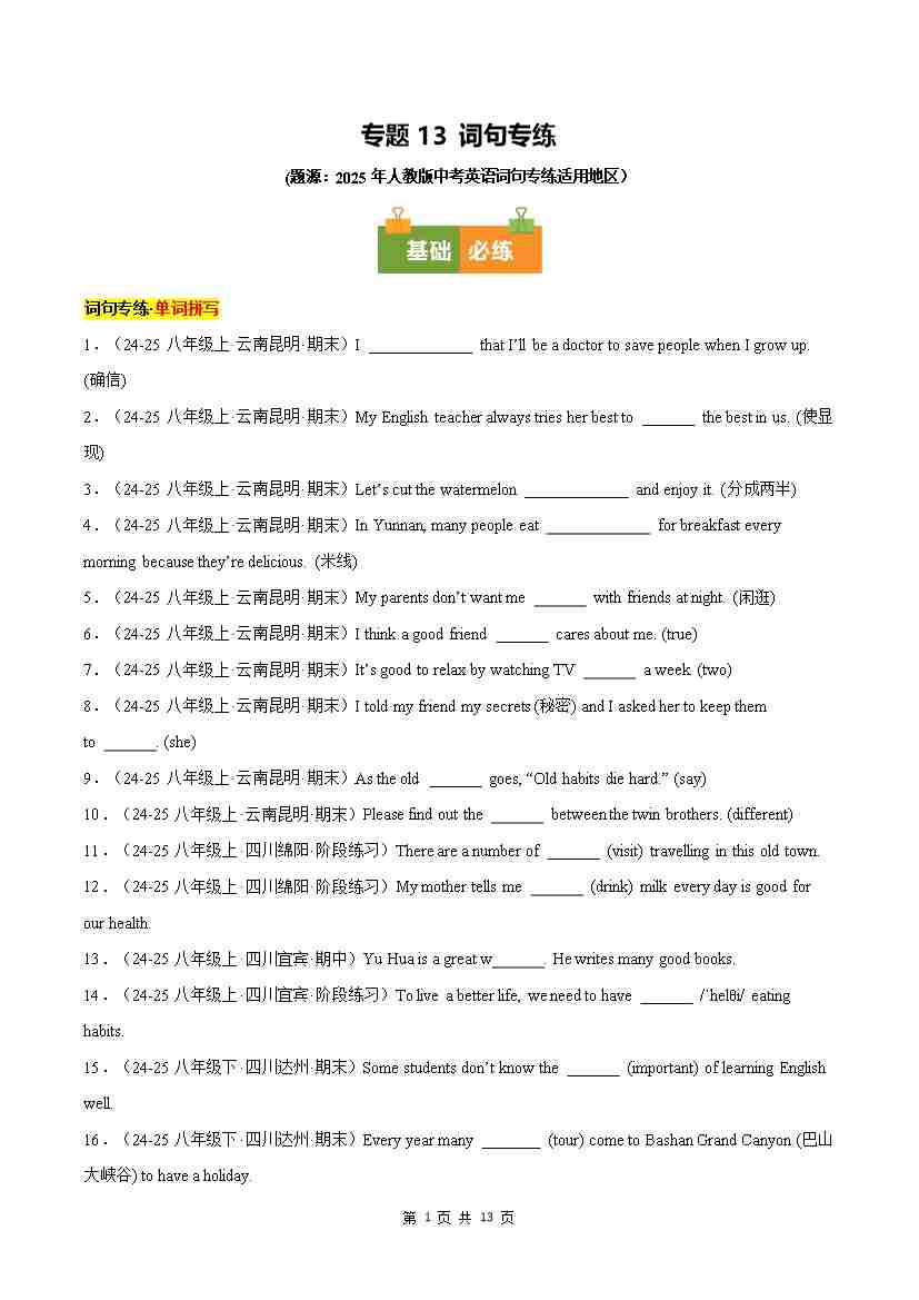 专题13 词句专练( 八年级上学期期末真题汇编,人教版)(解析版)