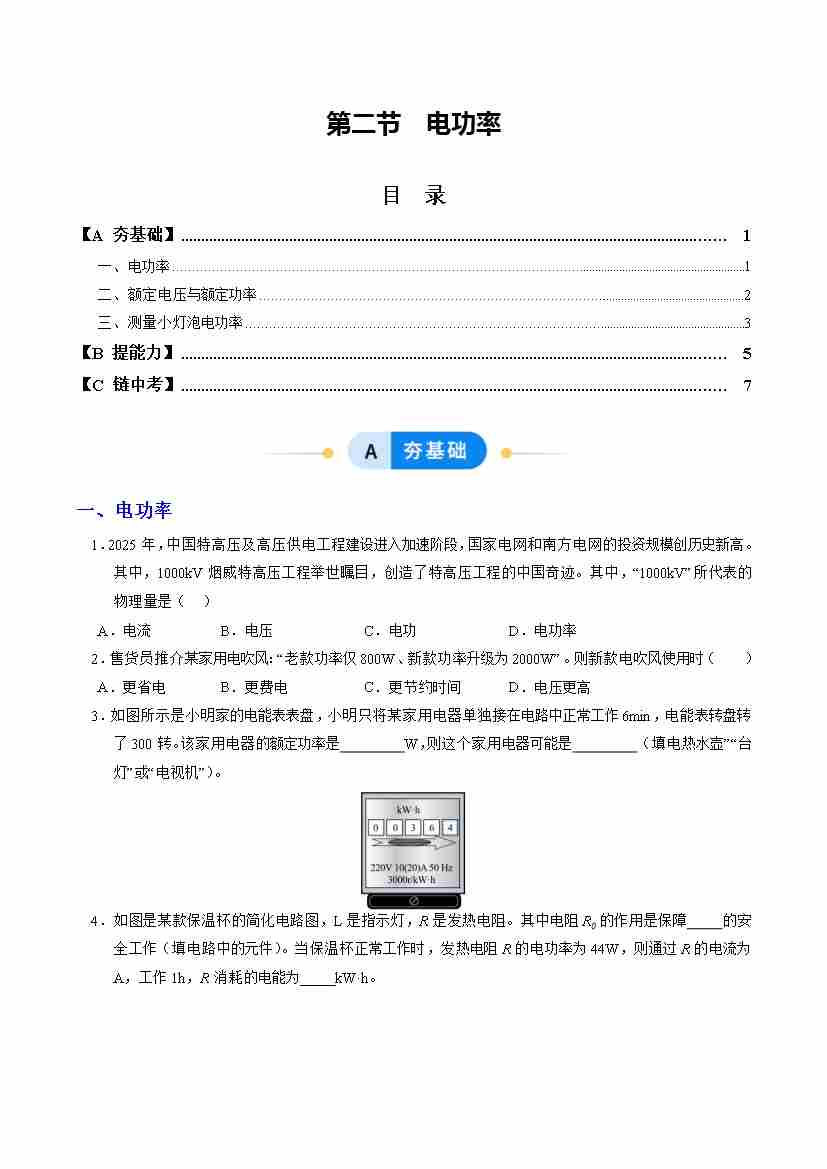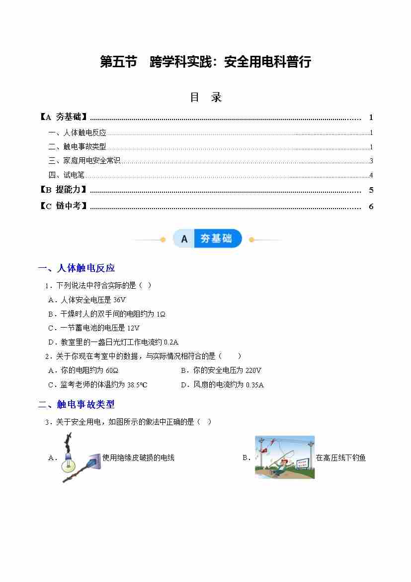 第十三章第五节 跨学科实践:安全用电科普行(分层作业)(原卷版)