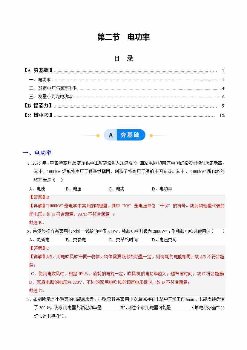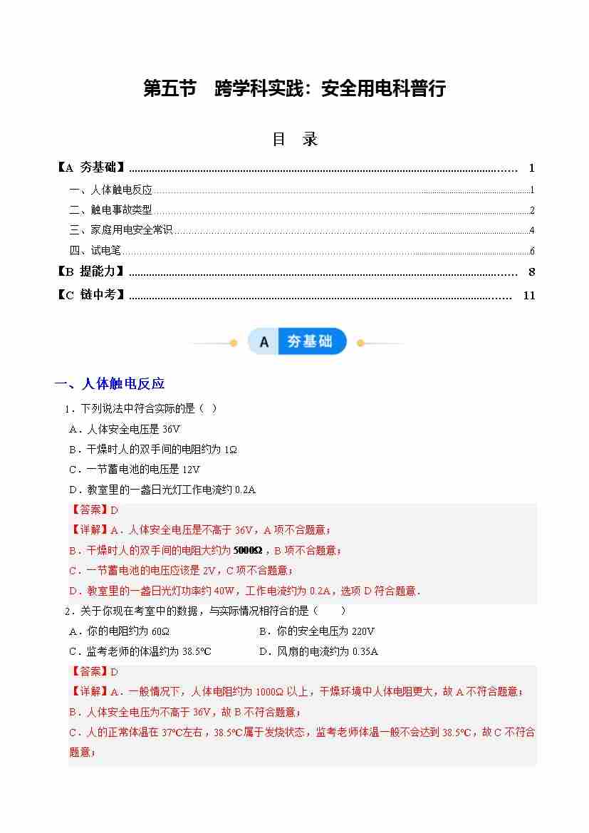 第十三章第五节 跨学科实践:安全用电科普行(分层作业)(解析版)