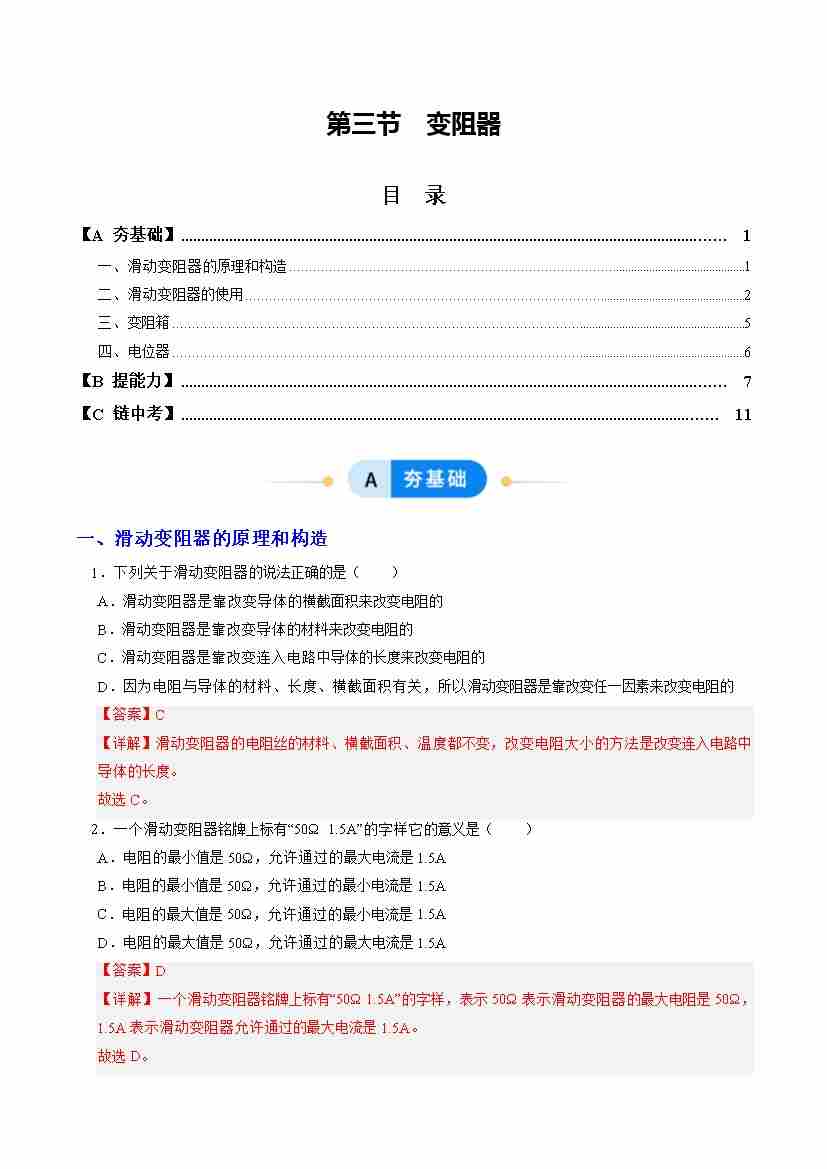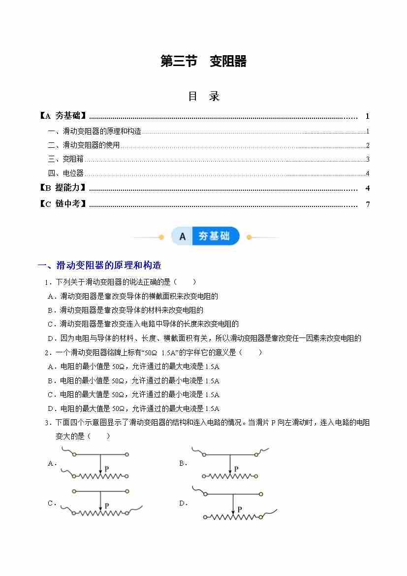 第十二章第三节 变阻器(分层作业)(原卷版)