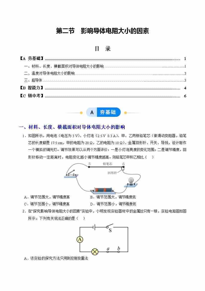 第十二章第二节 影响导体电阻大小的因素(分层作业)(原卷版)