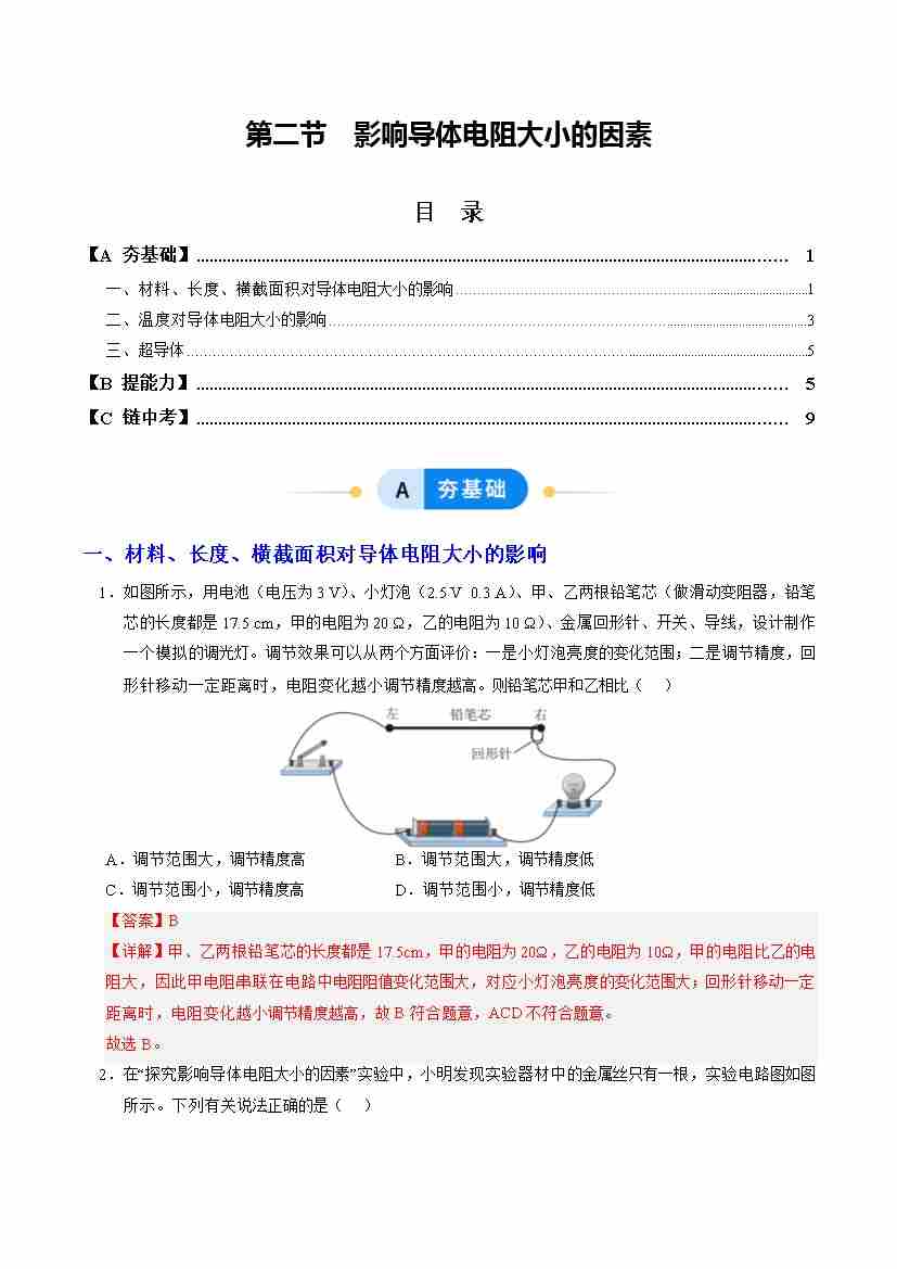第十二章第二节 影响导体电阻大小的因素(分层作业)(解析版)