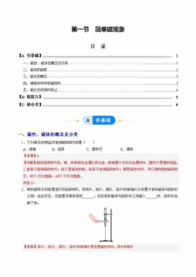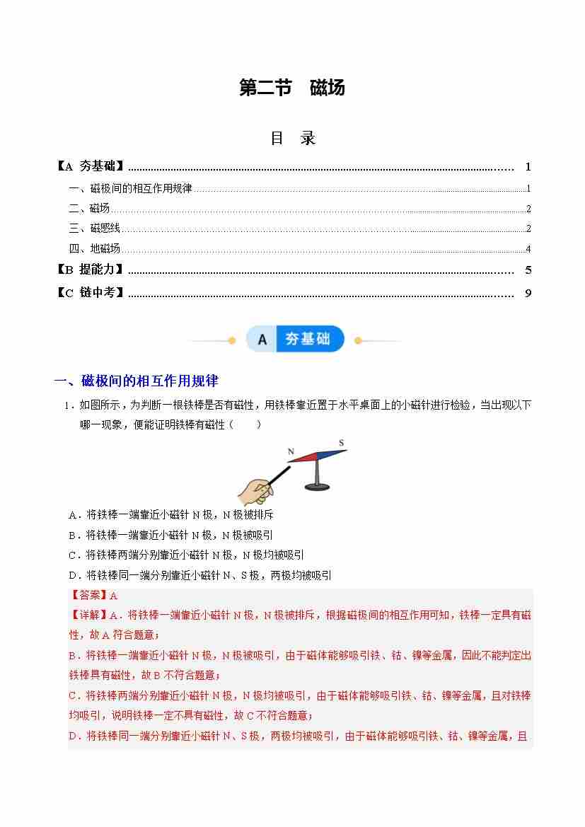 第十四章第一节 简单磁现象(分层作业)(解析版)