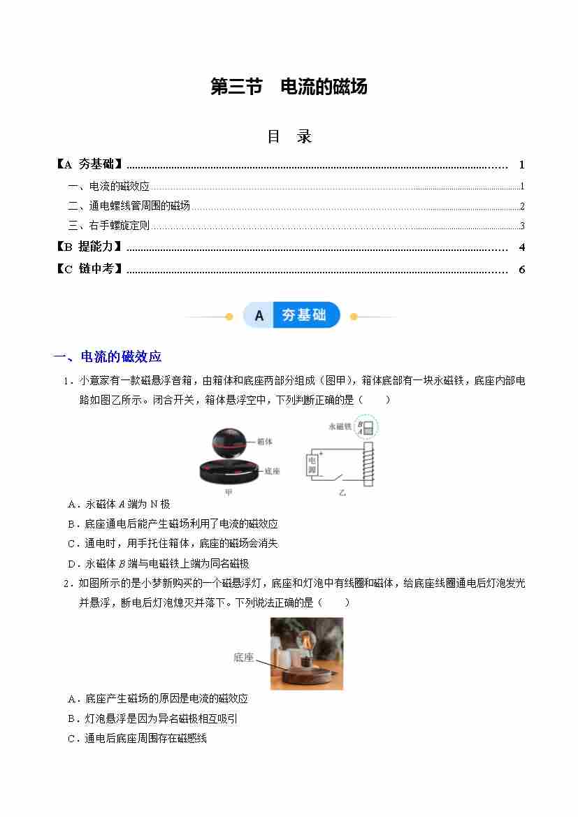第十四章第三节 电流的磁场(分层作业)(原卷版)