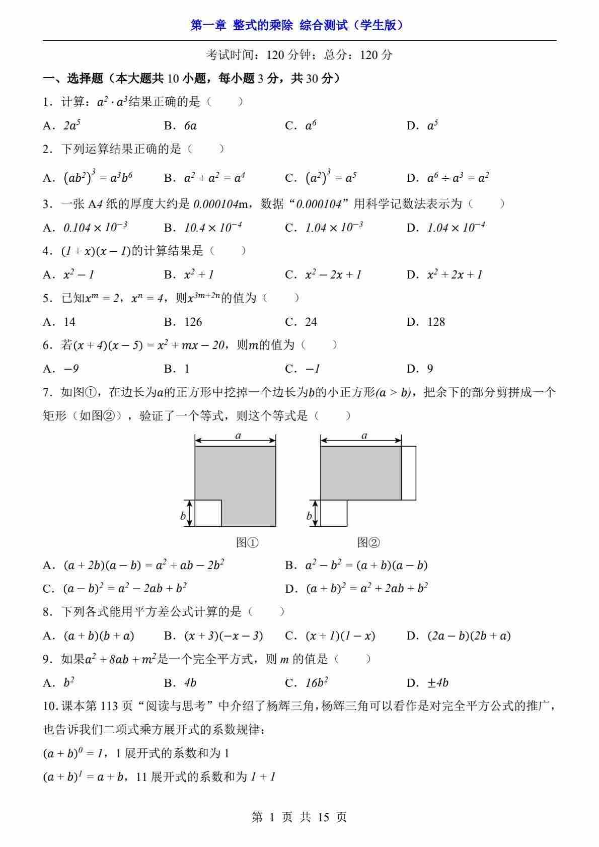 七下数学第一章 整式的乘除·基础卷(试题版A4)