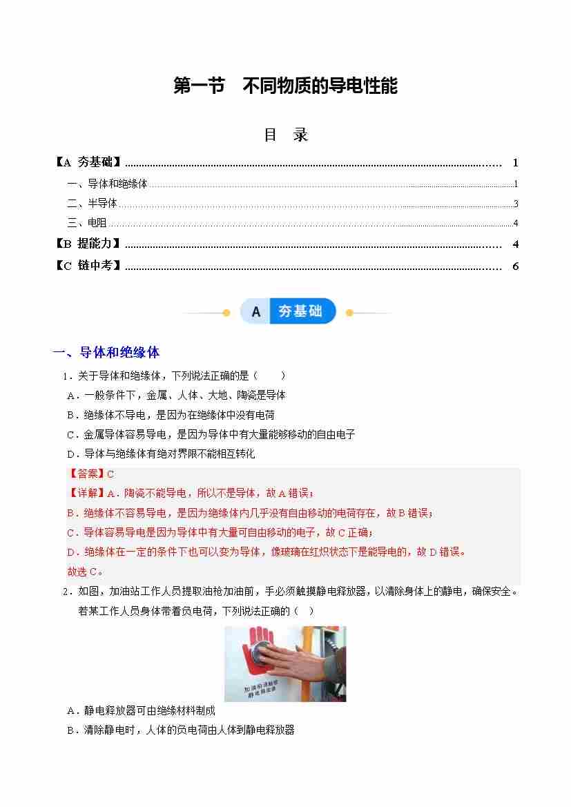 第十二章第一节 不同物质的导电性能(分层作业)(解析版)