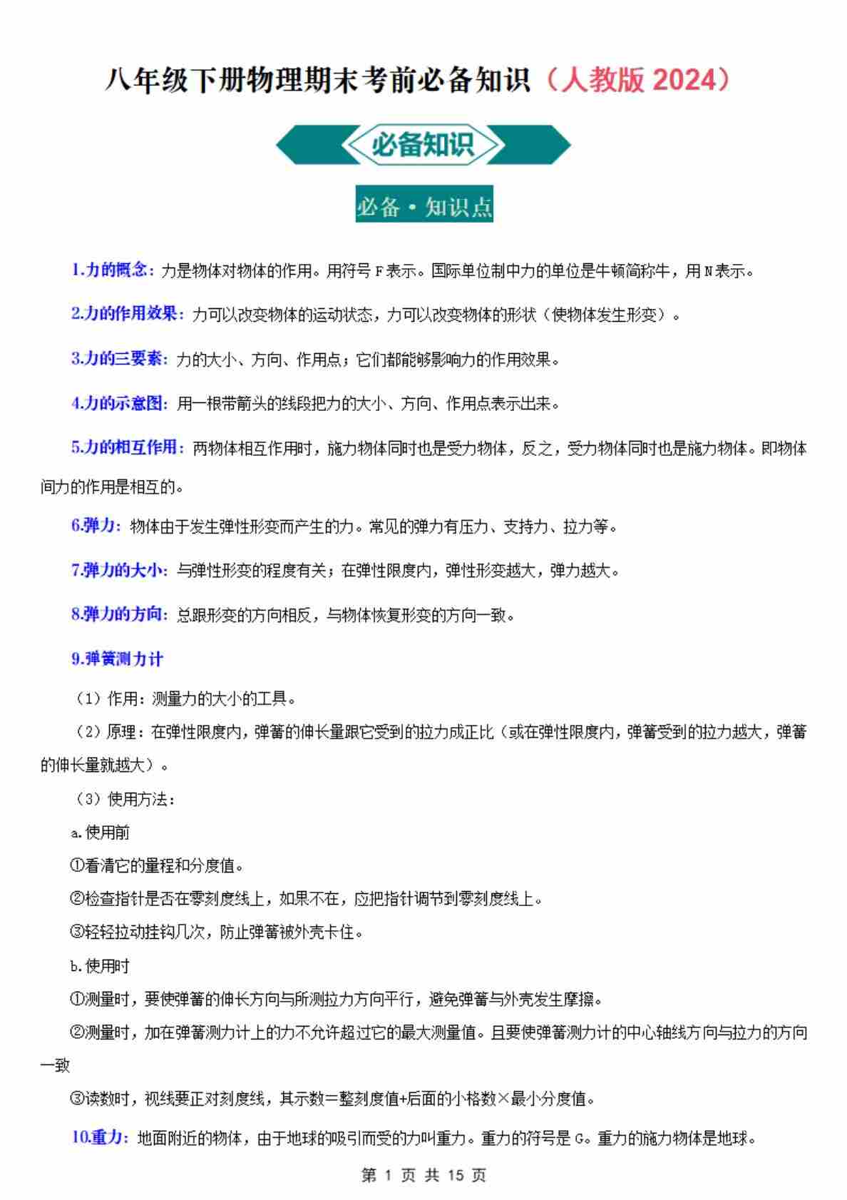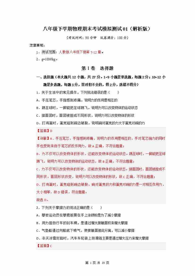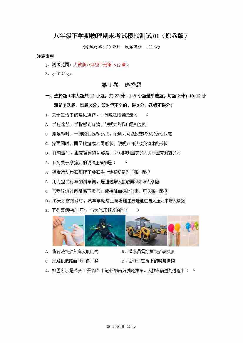 八年级下学期物理期末考试模拟测试01(原卷版)