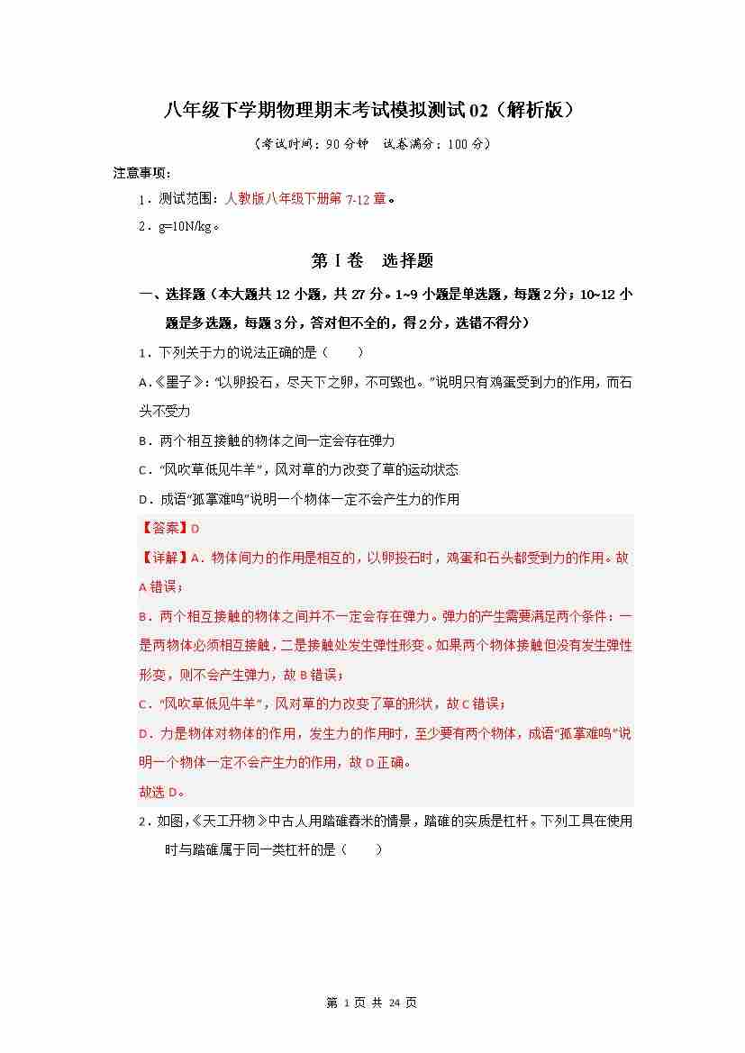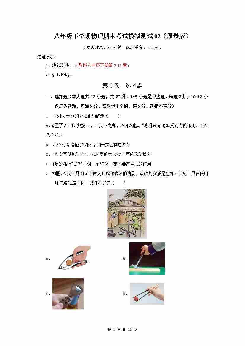 八年级下学期物理期末考试模拟测试02(原卷版)