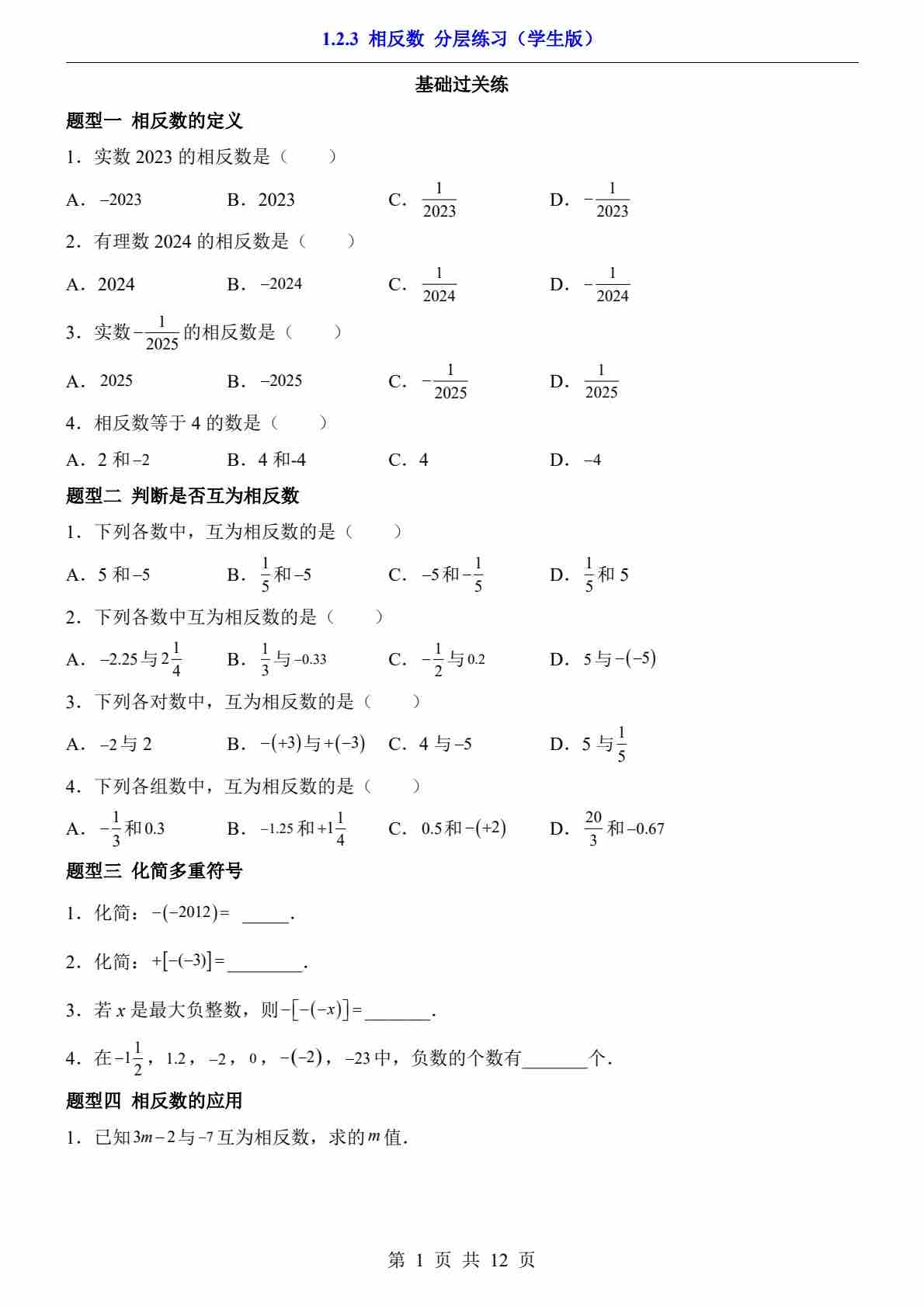 1.2.3 相反数(分层练习)