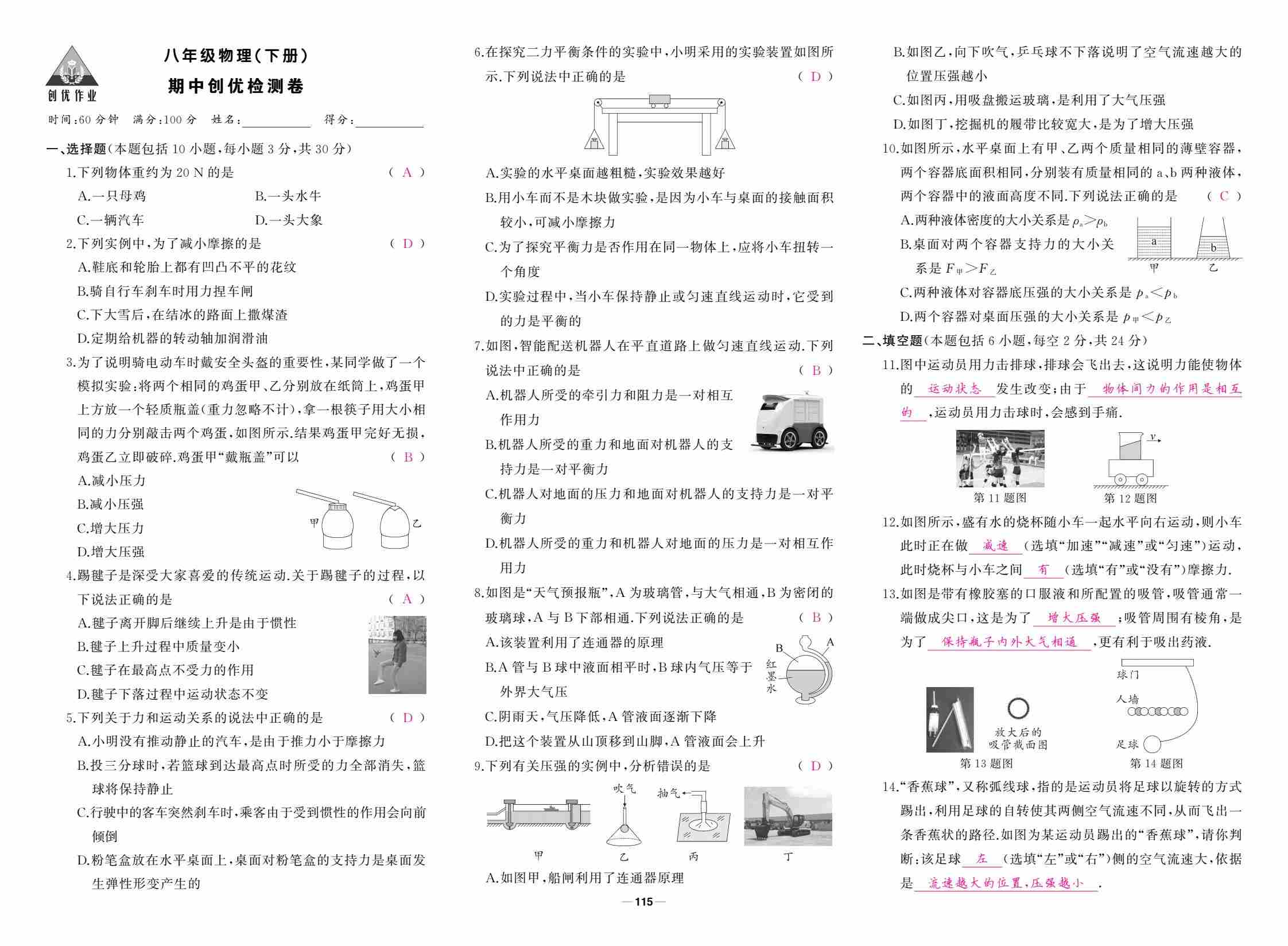 人教八下物理期中答案
