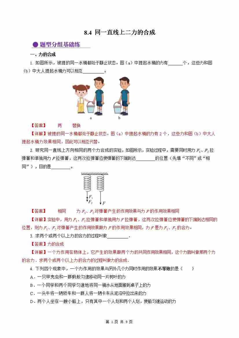8.4 同一直线上二力的合成(分层作业)【解析版】