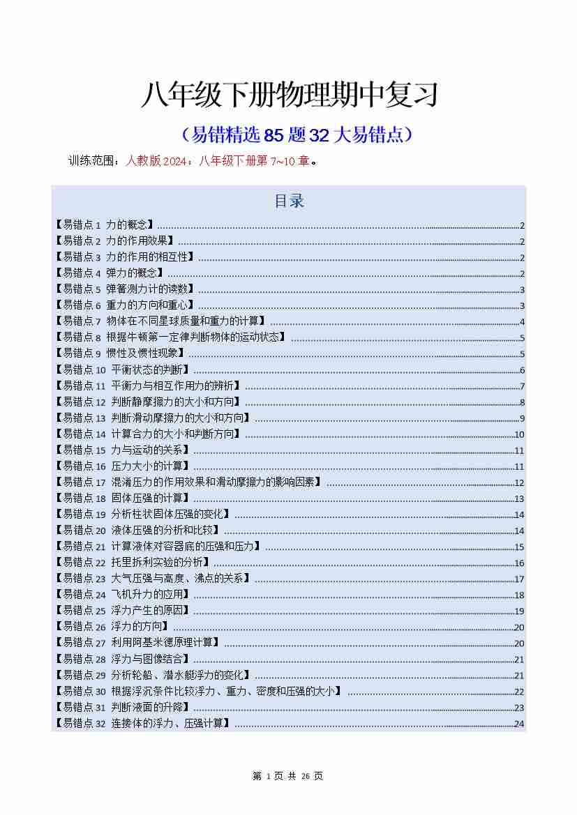 八年级下册物理期中复习(易错精选85题32个易错点)(人版2024)(原卷版)