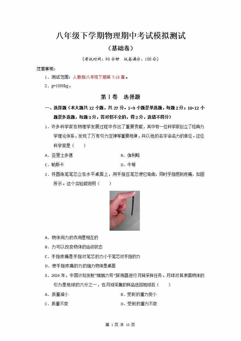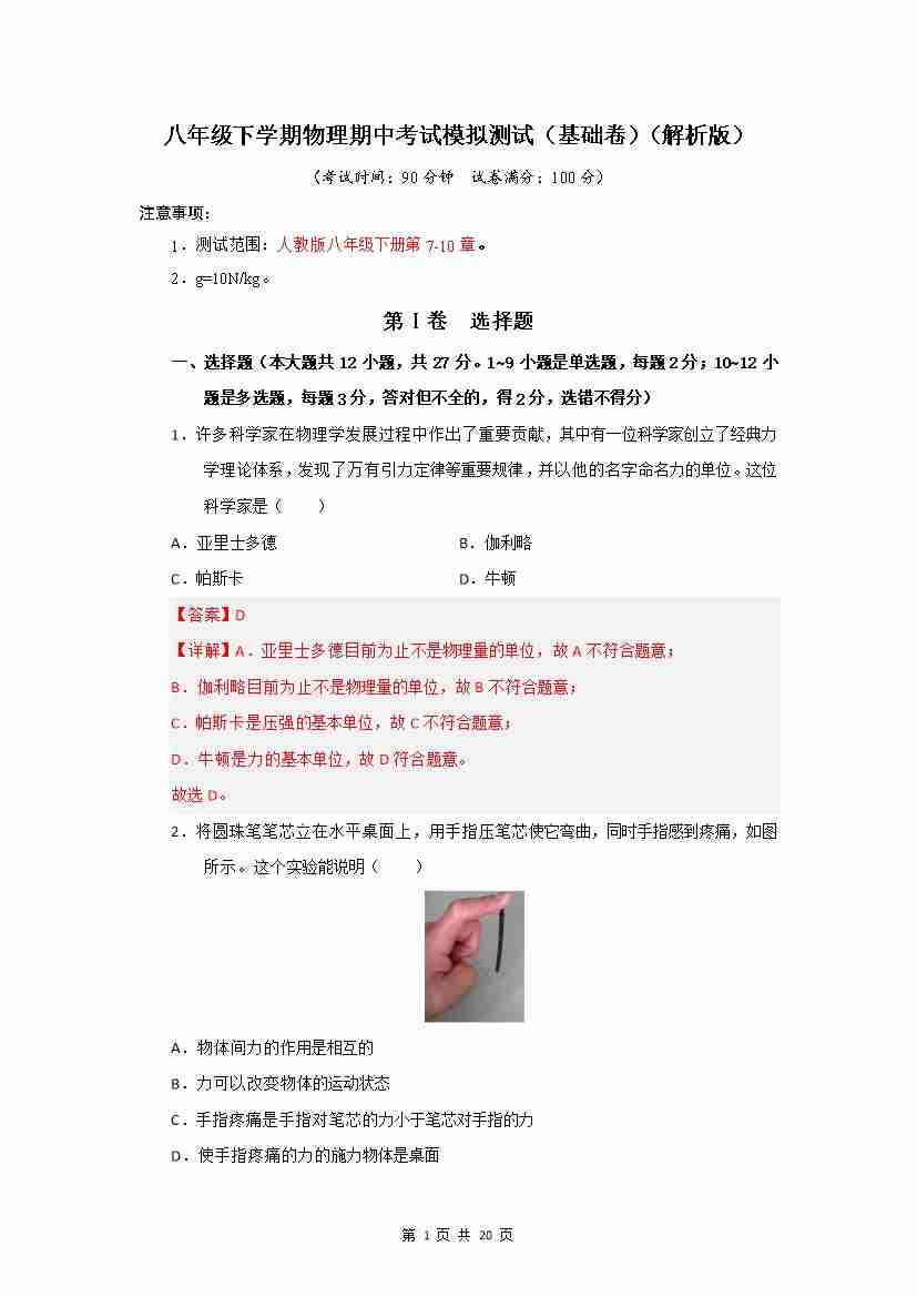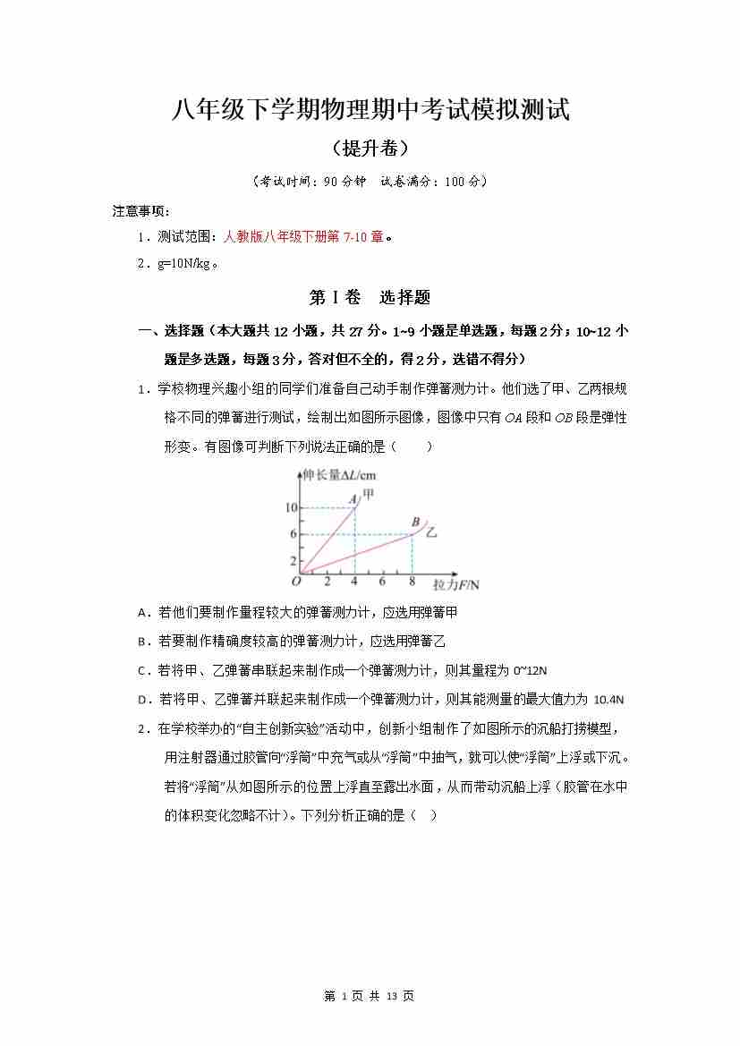 人教八下物理期中
