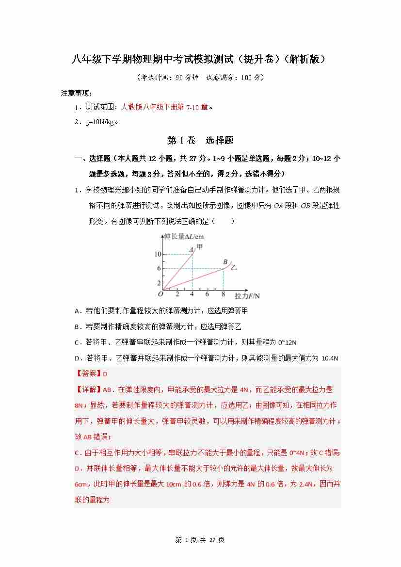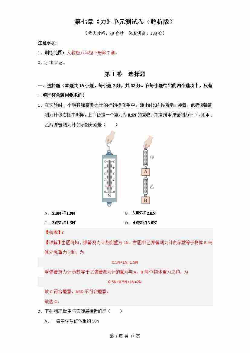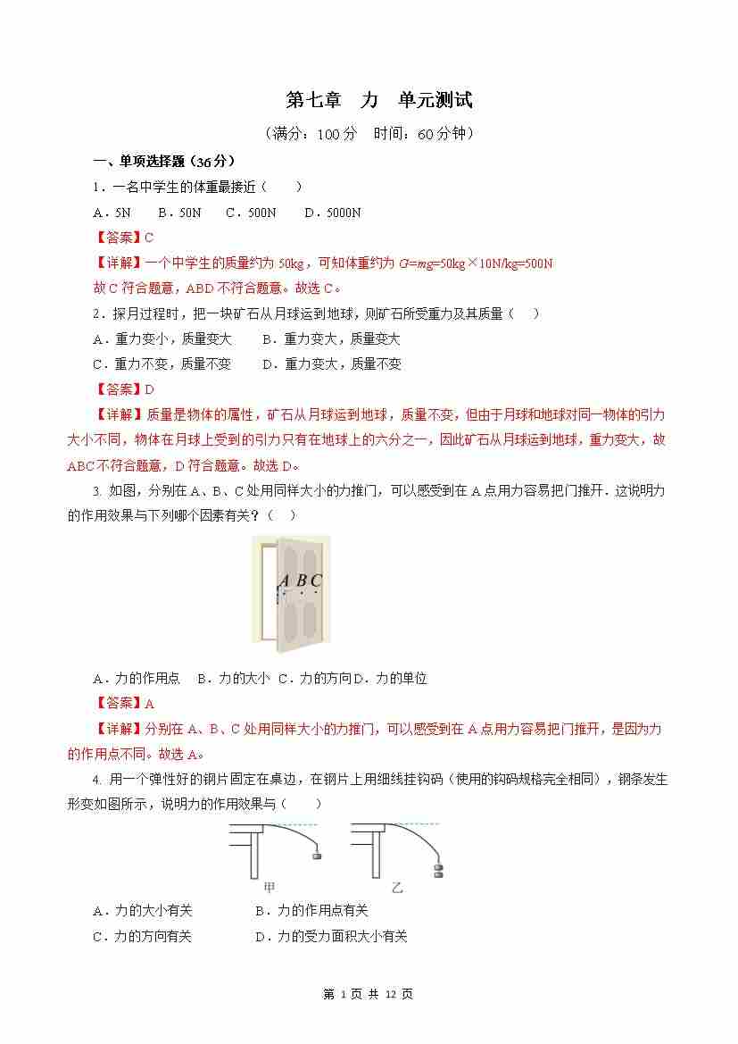 第7章 力(单元测试)【解析版】