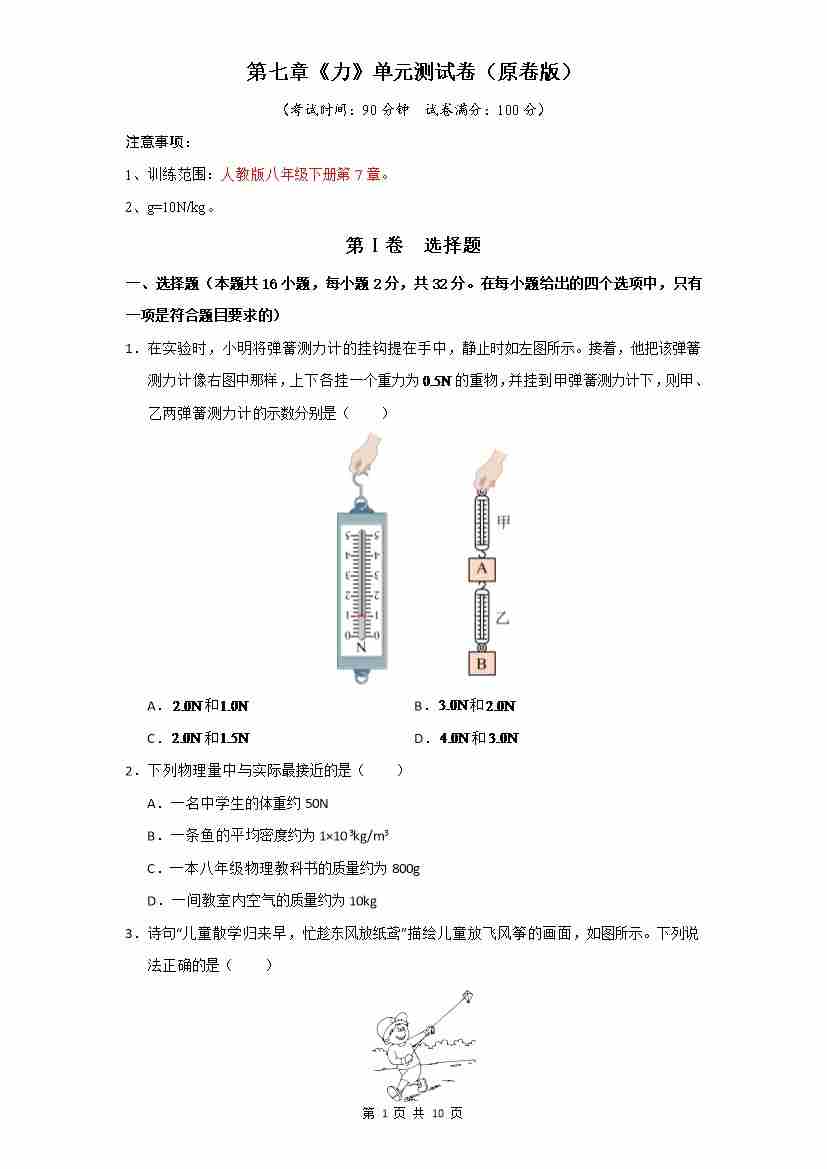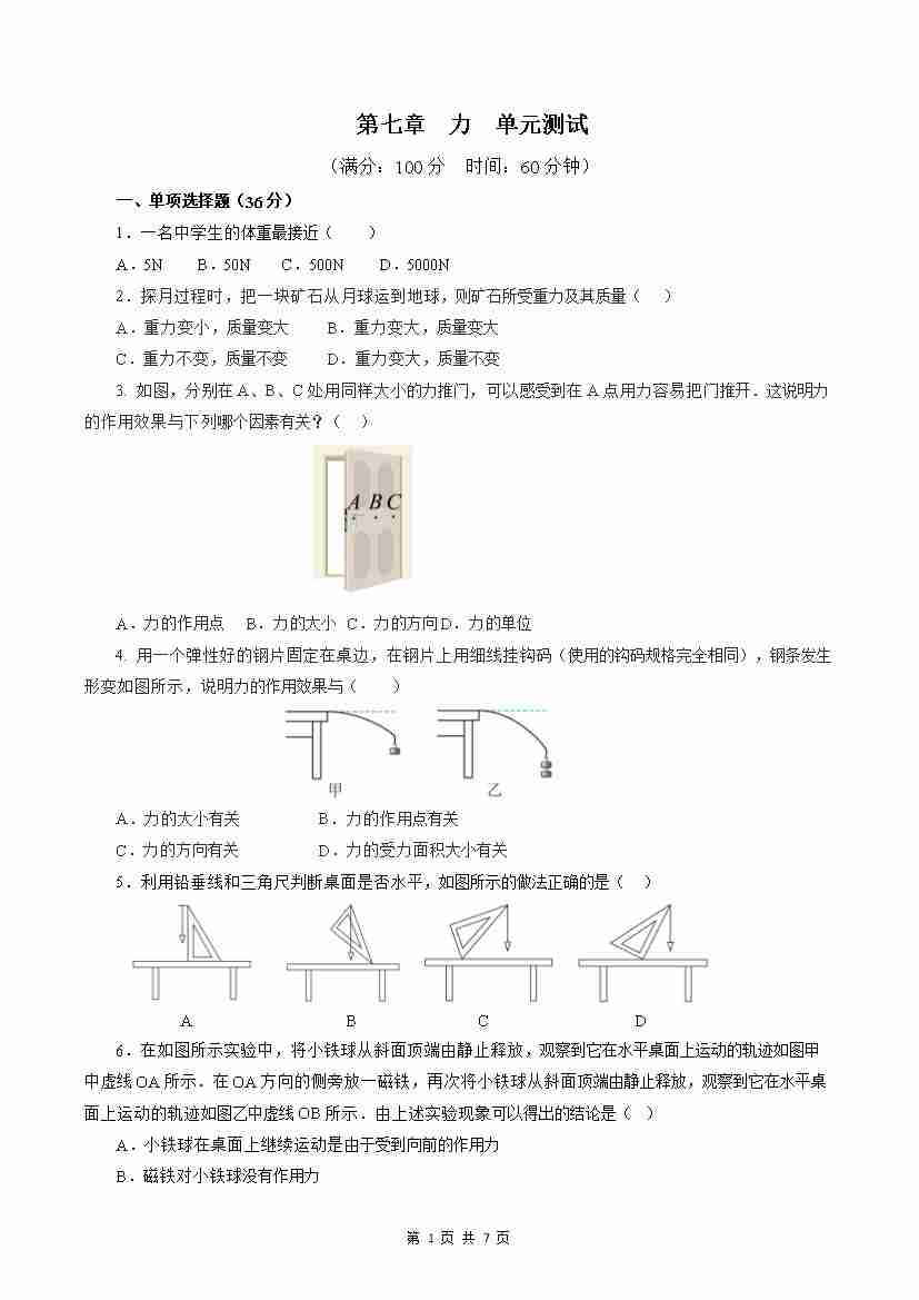 第7章 力(单元测试)【原卷版】