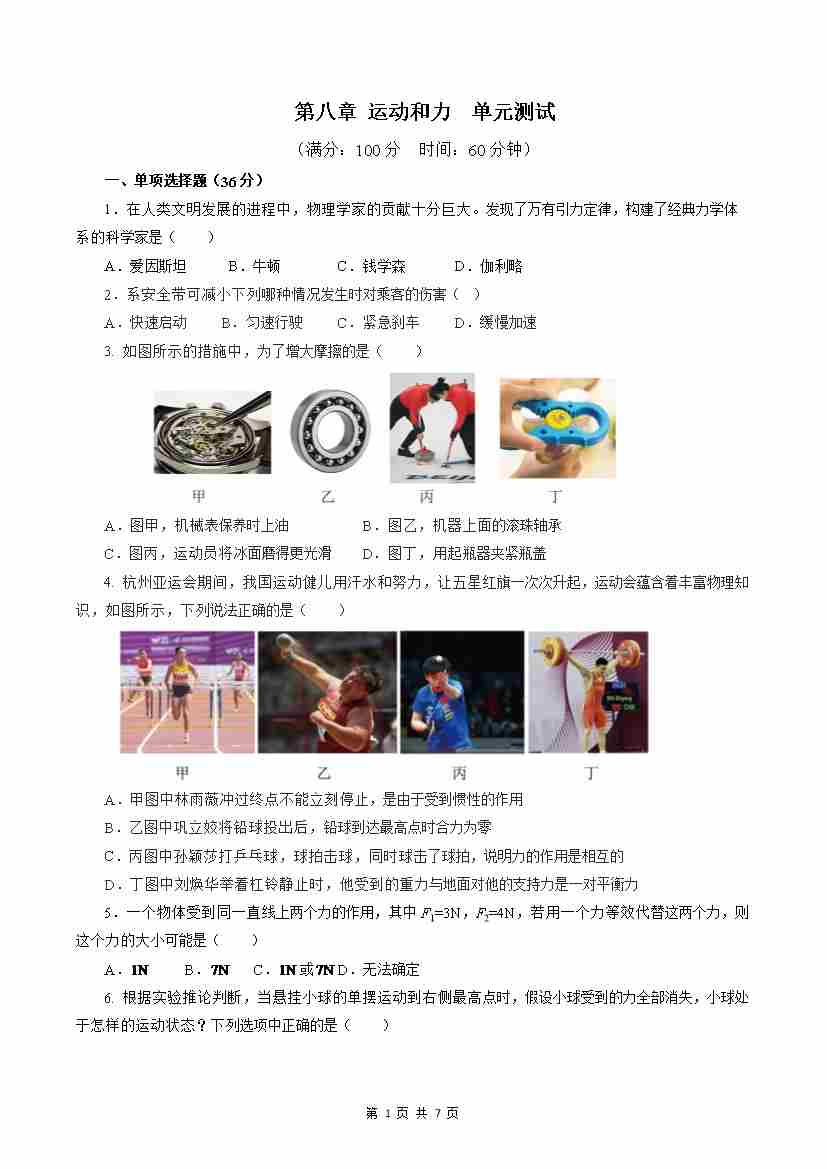 第8章 运动和力(单元测试)【原卷版】