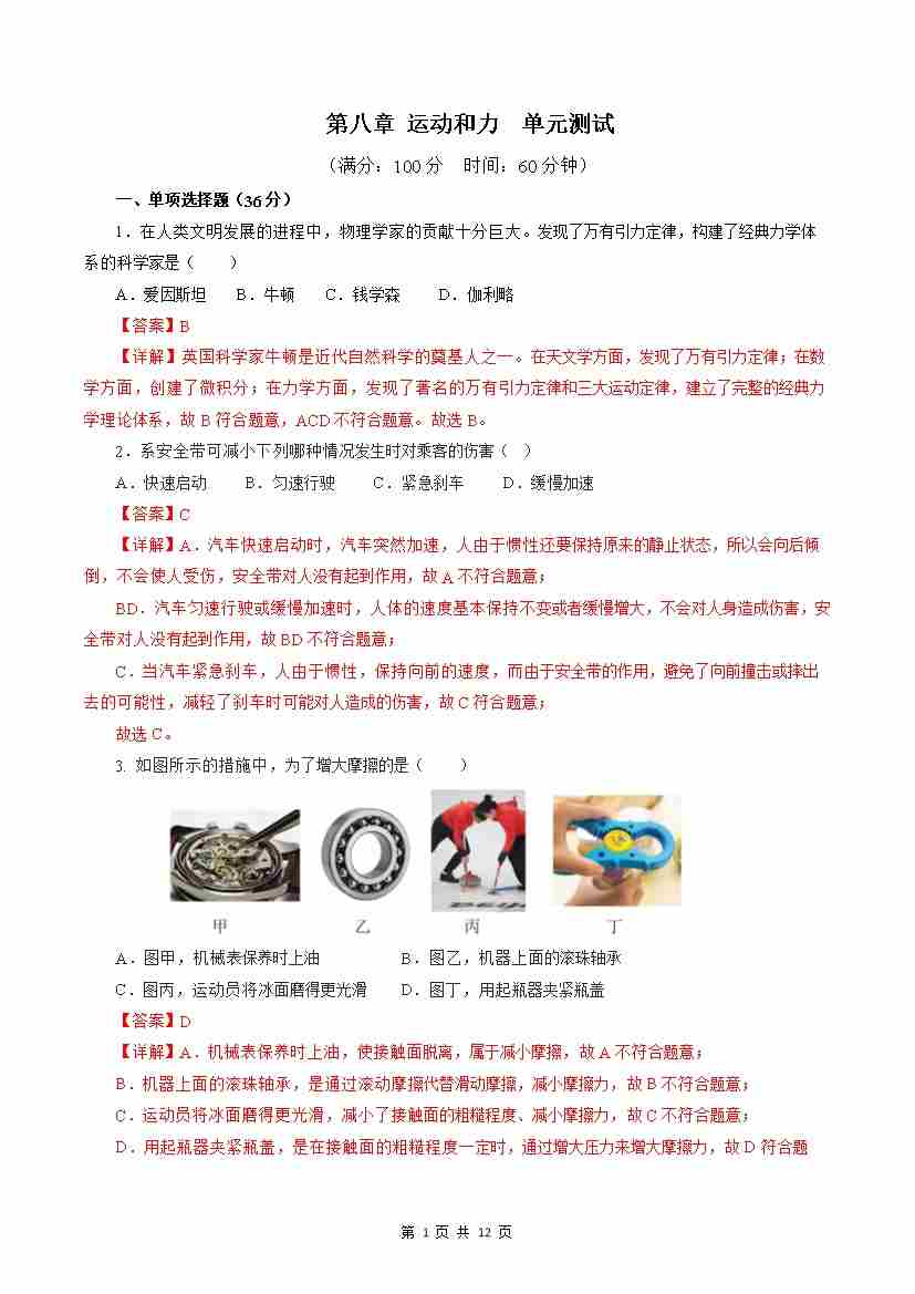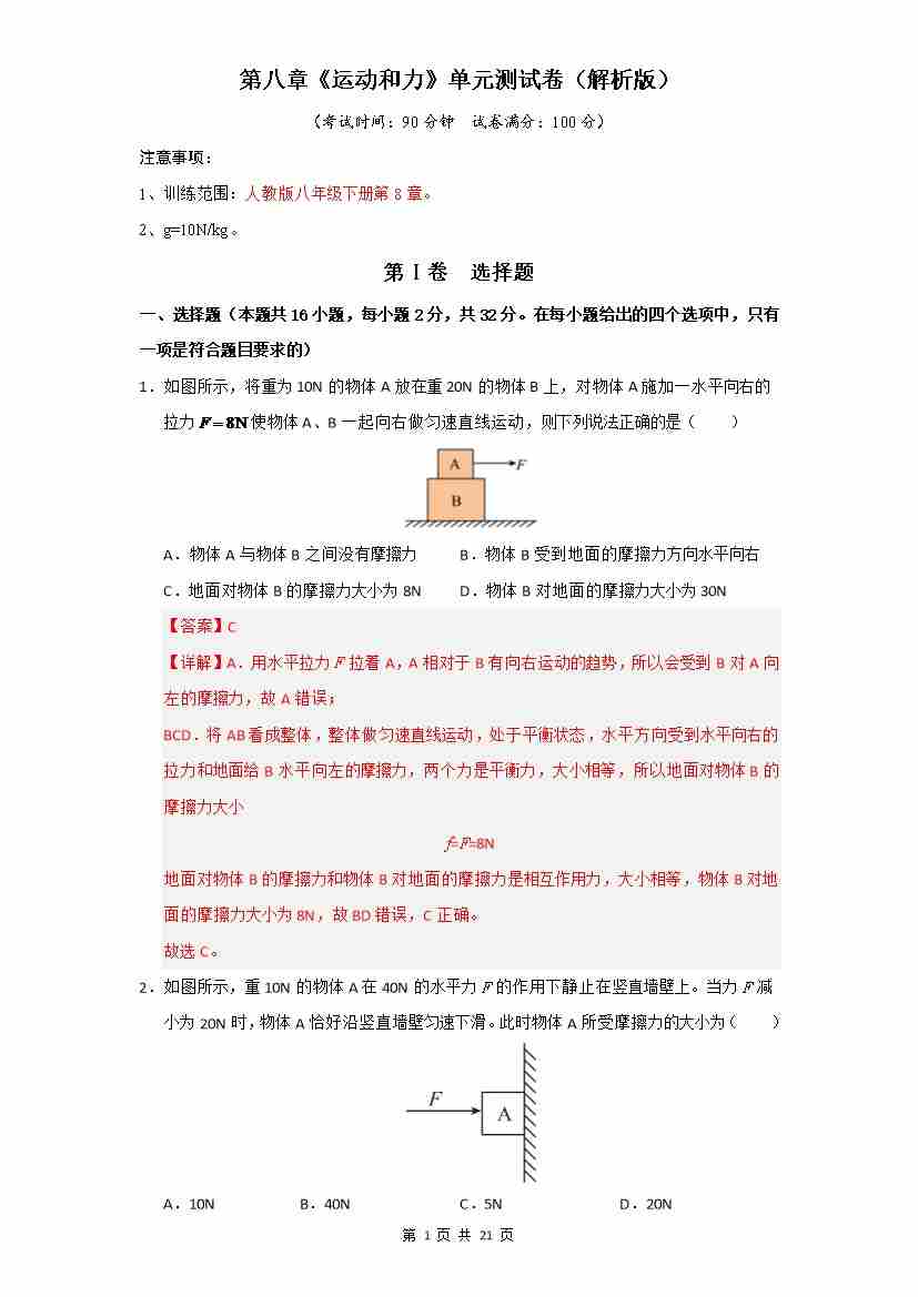 第8章 运动和力(单元测试)【解析版】