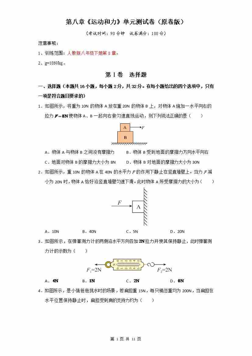 第8章《运动和力》单元测试卷(原卷版)