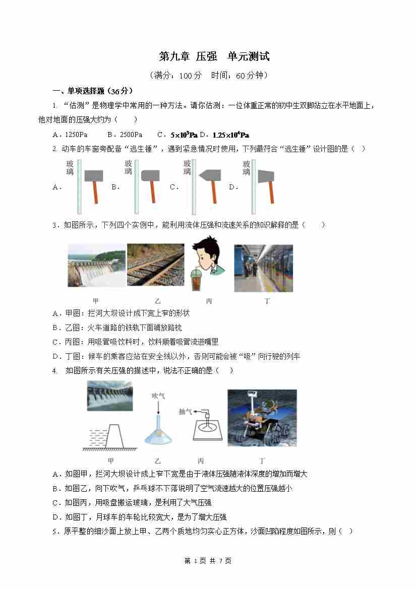 第9章 压强(单元测试)【原卷版】