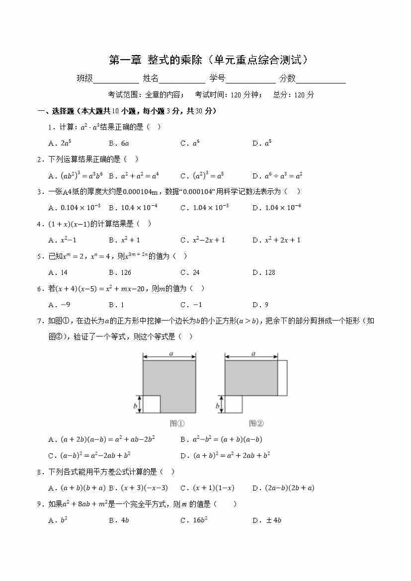 第一章 整式的乘除(单元重点综合测试)(原卷版)