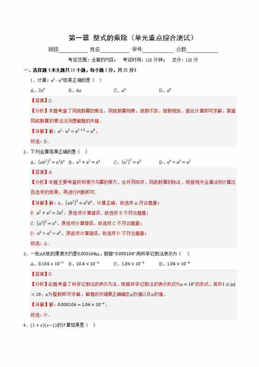 第一章 整式的乘除(单元重点综合测试)(解析版)