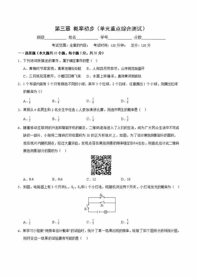 第三章 概率初步(单元重点综合测试)(原卷版)